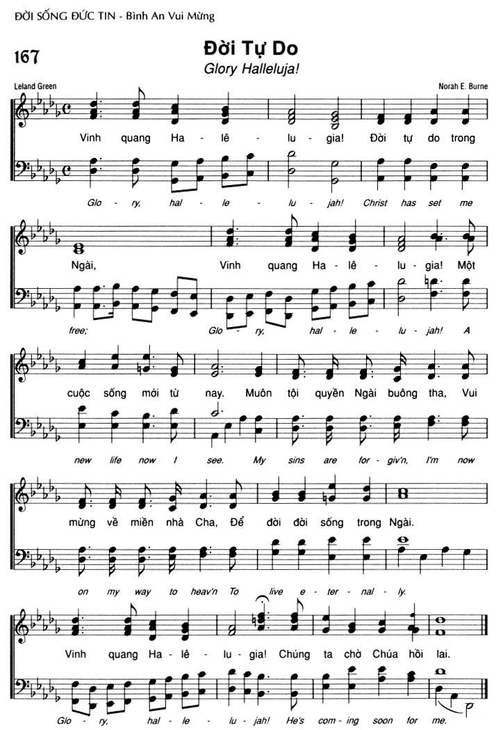Điệp khúc: Vinh quang Ha-lê-lu-gia! Đời tự do trong Ngài, cuộc sống mới từ nay. Muôn tội quyền Ngài buông tha, Vui mừng về miền nhà Cha, Để đời đời sống trong Ngài. Vinh quang Ha-lê-lu-gia! Chúng ta chờ Chúa hồi lai.