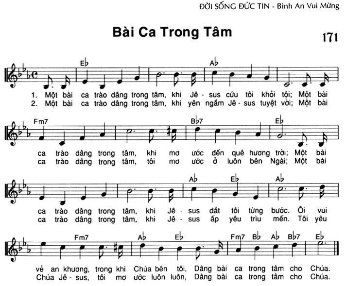 1. Một bài ca trào dâng trong tâm, khi Jê-sus cứu tôi khỏi tội; Một bài ca trào dâng trong tâm, khi mơ ước đến quê hương trời; Một bài ca trào dâng trong tâm, khi Jê-sus dắt tôi từng bước. Ôi vui vẻ an khương, trong khi Chúa bên tôi, Dâng bài ca trong tâm cho Chúa. 2. Một bài ca trào dâng trong tâm, khi yên ngắm Jê-sus tuyệt vời; Một bài ca trào dâng trong tâm, tôi mơ ước ở luôn bên Ngài; Một bài ca trào dâng trong tâm, khi Jê-sus ấp yêu mến. Tôi yêu Chúa Jê-sus, tôi mơ ước luôn luôn, Dâng bài ca trong tâm cho Chúa.