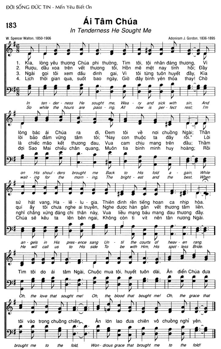 1. Kìa, lòng yêu thương Chúa phi thường, Tìm tôi, tội nhân đáng thương. Vì lòng bác ái Chúa ra đi, Đem tôi về nơi chuồng Ngài; Thần sứ hát vang, Ha-lê-lu-gia. Thiên đình rền tiếng hoan ca nhịp hòa. 2. Rượu, dầu xoa trên vết thương tôi, Hồn mê mệt nay tỉnh hồi; Đây lời bảo đảm vững tâm tôi; "Nay con thuộc ta đây rồi." Nghe được hàn gắn vết thương tâm liền. Quí ấy tôi chưa nghe ai truyền. 3. Ngài gọi tôi xem dấu đinh gai, Vì tôi từng tuôn huyết đầy, Kìa là chiếc mão kết thương đau, Vua cam chịu mang trên đầu; Thầm nghĩ chẳng xứng đáng chi thân này, Vua liều mạng báu mang đau thương đầy. 4. Lịch thời gian qua, suốt bao ngày, Giờ đây bình yên thỏa thay! Chờ đợi Sao Mai chiếu chân quang, Muôn tia bình minh huy hoàng; Rồi Chúa sẽ kêu ta lên bên ngai, Không còn tì vít nên tân nương Ngài. Điệp khúc: Tìm tôi do ái tâm Ngài, Chuộc mua tôi, huyết tuôn dài, Ân điển Chúa đưa tôi vào trong chuồng chiên, Ân lớn lao đưa chiên vô chuồng nghỉ yên.
