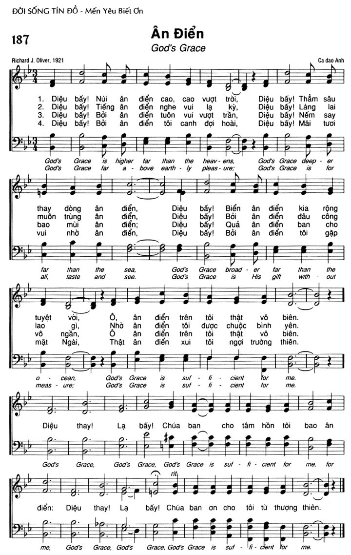 1. Diệu bấy! Núi ân điển cao, cao vượt trời, Diệu bấy! Thẳm sâu thay dòng ân điển, tuyệt vời, Ô, ân điển trên tôi thật vô biên. 2. Diệu bấy! Tiếng ân điển nghe vui lạ kỳ, Diệu bấy! Láng lai muôn trùng ân điển, lao gì, Nhờ ân điển tôi được chuộc bình yên. 3. Diệu bấy! Bởi ân điển tuôn vui vượt trần, Diệu bấy! Nếm say bao mùi ân điển: vô ngân, Ô ân điển trên tôi thật vô biên. 4. Diệu bấy! Bởi ân điển tôi canh đợi hoài, Diệu bấy! Mãi tươi vui nhờ ân điển, mặt Ngài, Thật ân điển xui tôi ngợi trường thiên. Điệp khúc: Diệu thay! Lạ bấy! Chúa ban cho tâm hồn tôi bao ân điển: Diệu thay! Lạ bấy! Chúa ban ơn cho tôi từ thượng thiên.
