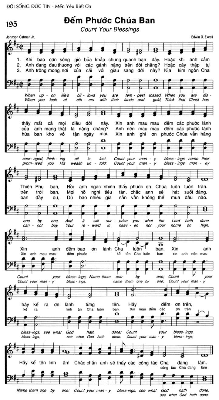 1. Khi bao cơn sóng gió bủa khắp chung quanh bạn đây. Hoặc khi anh cảm thấy mất cả mọi điều đời này. Xin anh mau mau đếm các phước lành Thiên Phụ ban, Rồi anh ngạc nhiên thấy phước ơn Chúa luôn tuôn tràn. 2. Anh đang đau thương với các gánh nặng trên đời chăng? Hoặc cây thập tự của anh mang thật là nặng chăng? Anh nên mau mau đếm các phước lành trên trời ban, Mọi hồ nghi tiêu tán, chắc anh sẽ hát suốt đàng. 3. Anh trông mong nơi của cải với giàu sang đời này? Kia kim ngôn Cha hứa ban kho vô tận ngày mai. Xin anh ghi ơn phước Chúa vẫn hằng ban đầy dư, Dù bao nhiêu gia sản vẫn không thể mua đâu nào. Điệp khúc: Xin anh đếm bao ơn lành Cha luôn ban, Xin anh hãy kể ra ơn lành từng tên. Hãy đếm ơn trên, Xin anh mau đếm các ơn trên. Hãy kể tên linh ân! Chắc chắn anh sẽ thấy các công tác Cha đang làm.