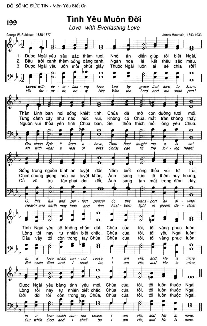 1. Được Ngài yêu sâu sắc thắm tươi, Nhờ ân điển giúp tôi biết Ngài, Thần Linh ban hơi sống khiết tinh, Chúa đã mở con đường tươi mới. Sống trong nguồn bình an tuyệt đối! Nếm biết sông thỏa vui từ trời, Tình Ngài yêu sẽ không chấm dứt, Chúa của tôi, tôi vâng phục luôn; Được Ngài yêu bằng tình yêu mới, Chúa của tôi, tôi luôn thuộc Ngài. 2. Bầu trời xanh thêm bóng dáng xanh, Ngàn hoa lá kết thêu sắc màu, Từng cành cây như náo nức vui, Không có Chúa, mắt trần không thấy. Chim chung giọng hòa ca tuyệt khúc, Ánh sáng tươi tô thêm huy hoàng, Lòng tôi nay tự nhiên biết chắc, Chúa của tôi, tôi yêu Ngài luôn; Lòng tôi nay tự nhiên biết chắc, Chúa của tôi, tôi luôn thuộc Ngài. 3. Được Ngài yêu luôn mỗi phút giây, Thuộc Ngài luôn ai sẽ chia rời? Nguồn vui thỏa yên tĩnh Chúa ban, Sẽ thỏa thích mỗi lòng yêu Chúa. Cả vũ trụ tàn phai dời đổi, Ánh sáng tan mất trong đêm dày, Dầu vậy tôi còn trong tay Chúa, Chúa của tôi, tôi vâng phục luôn; Đời đời tôi còn trong tay Chúa, Chúa của tôi, tôi luôn thuộc Ngài.