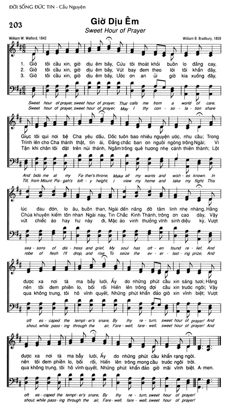 1. Giờ tôi cầu xin, giờ dịu êm bấy, Cứu tôi thoát khỏi buồn lo đắng cay, Giục tôi quì nơi bệ Cha yêu dấu, Dốc tuôn bao nhiêu nguyện ước, nhu cầu; lúc đau đớn, lo âu, buồn than, Ngài đến nâng đỡ tâm linh nhẹ nhàng, Hằng được xa nơi tà ma bầy lưới, Ấy do những phút cầu xin sáng tươi; Hằng được xa nơi tà ma bầy lưới, Ấy do những phút cầu khẩn rạng ngời. 2. Giờ tôi cầu xin, giờ dịu êm bấy, Vút bay đem theo lời tôi khẩn đây, Trình lên cho Cha thành thật, tín ái, Đấng chắc ban ơn người ngóng trông Ngài; Chúa khuyên kiếm tôn nhan Ngài nay, Tin Chắc Kinh Thánh, trông ơn cao dày, Vậy nên tôi đem phiền lo, bối rối Hiến lên trông đợi cầu xin trước ngôi; Vậy nên tôi đem phiền lo, bối rối, Hiến lên trông mong cầu trước ngôi trời. 3. Giờ tôi cầu xin, giờ dịu êm bấy, Ước ơn an ủi giờ kia xuống đây, Tận khi chân tôi đặt trên núi thánh, Ngắm trông quê hương nhẹ cánh thiên thành; Lột vứt chiếc áo hay hư này đi, Mặc áo vinh thưởng vĩnh sinh diệu kỳ, Vượt qua không trung, tôi hô vĩnh quyết, Những phút khẩn đảo giờ xin vĩnh biệt; Vượt qua không trung, tôi hô vĩnh quyết, Những phút khẩn đảo giờ mãi vĩnh biệt. A-men. Điệp khúc: Sweet hour of prayer, sweet hour of prayer, That calls me from a world of care, And bids me at my Fa-ther's throne, Make all my wants and wishes known. In sea-sons of dis-tress and grief, My soul has oft-en found re-lief. And oft es-caped the tempt-er's snare, By thy re-turn, sweet hour of prayer! oft es-caped the tempt-er's snare, By thy re-turn, sweet hour of prayer! Sweet hour of prayer, sweet hour of prayer, May I thy con-so-la-tion share Till, from Mount Pis-gah's lof-ty height, I view my home and take my flight. This robe of flesh I'll drop, and rise To seize the ev-er-last-ing prize. And shout, while pass-ing through the air, Fare-well, fare-well, sweet hour of prayer! shout, while pass-ing through the air, Fare-well, fare-well, sweet hour of prayer!