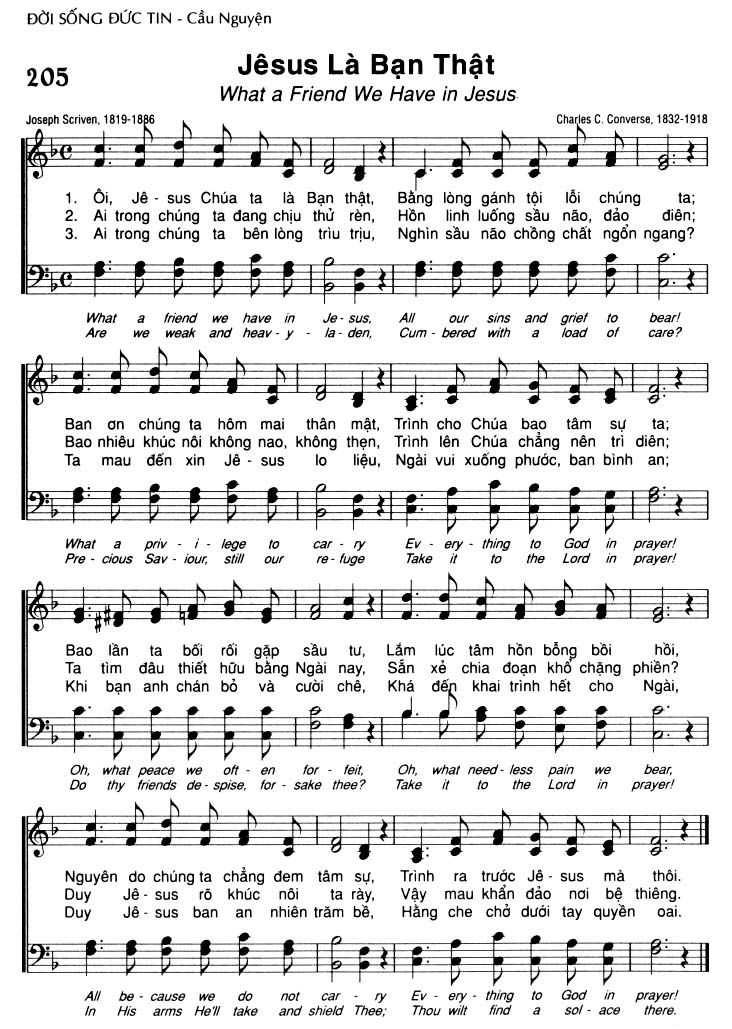 1. Ôi, Jêsus Chúa ta là Bạn thật, Bằng lòng gánh tội lỗi chúng ta; Ban ơn chúng ta hôm mai thân mật, Trình cho Chúa bao tâm sự ta; Bao lần ta bối rối gặp sầu tư, Lắm lúc tâm hồn bồng bồi hồi, Nguyên do chúng ta chẳng đem tâm sự, Trình ra trước Jêsus mà thôi. 2. Ai trong chúng ta đang chịu thử rèn, Hồn linh luống sầu não, đảo điên; Bao nhiêu khúc nôi không nao, không thẹn, Trình lên Chúa chẳng nên trì diên; Ta tìm đâu thiết hữu bằng Ngài nay, Sẵn xẻ chia đoạn khổ chặng phiền? Duy Jêsus rõ khúc nôi ta rày, Vậy mau khẩn đảo nơi bệ thiêng. 3. Ai trong chúng ta bên lòng trìu trịu, Nghìn sầu não chồng chất ngổn ngang? Ta mau đến xin Jêsus lo liệu, Ngài vui xuống phước, ban bình an; Khi bạn anh chán bỏ và cười chê, Khá đến khai trình hết cho Ngài, Duy Jêsus ban an nhiên trăm bề, Hằng che chở dưới tay quyền oai.