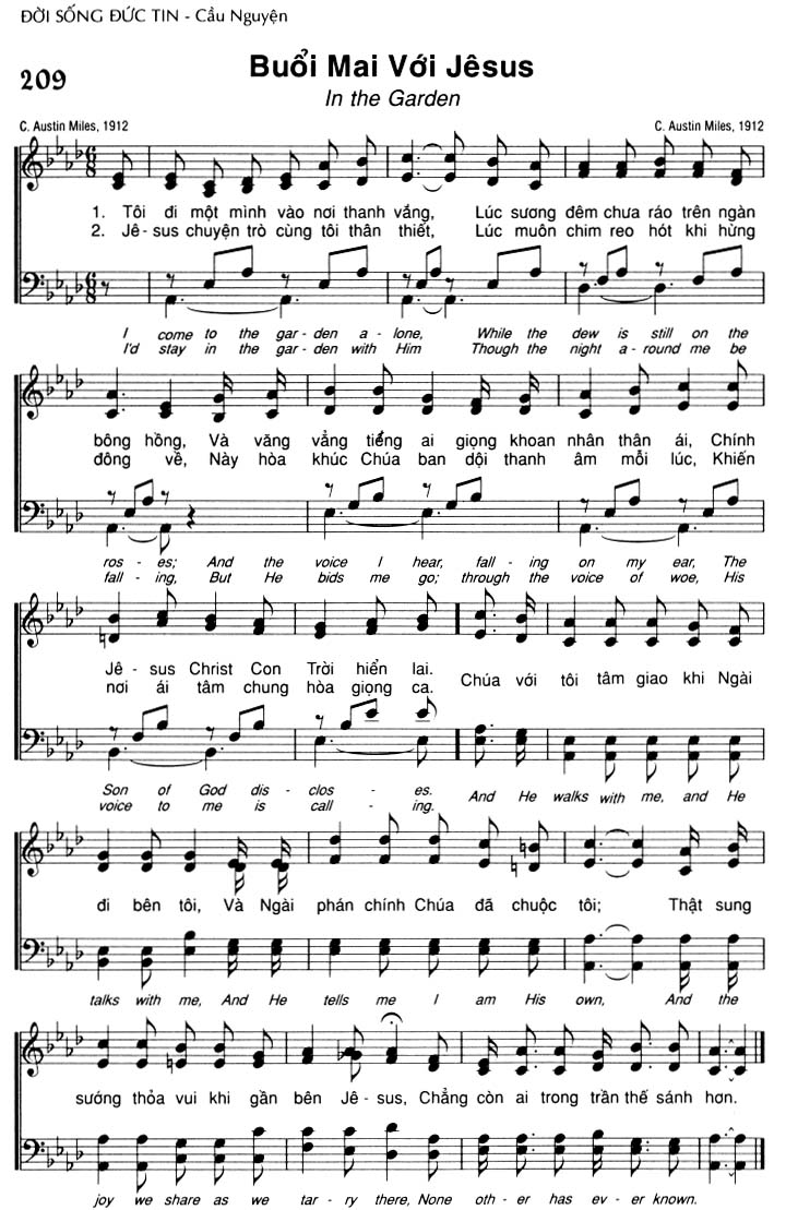 1. Tôi đi một mình vào nơi thanh vắng, Lúc sương đêm chưa ráo trên ngàn bông hồng, Và văng vẳng tiếng ai giọng khoan nhân thân ái, Chính Jêsus Christ Con Trời hiển lai. 2. Jêsus chuyện trò cùng tôi thân thiết, Lúc muôn chim reo hót khi hừng đông về, Này hòa khúc Chúa ban dội thanh âm mỗi lúc, Khiến nơi ái tâm chung hòa giọng ca. Điệp khúc: Chúa với tôi tâm giao khi Ngài đi bên tôi, Và Ngài phán chính Chúa đã chuộc tôi; Thật sung sướng thỏa vui khi gần bên Jêsus, Chẳng còn ai trong trần thể sánh hơn.