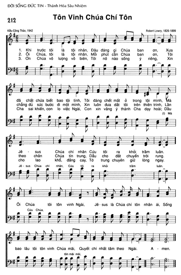 1. Khi trước tôi là tội nhân, Đâu đáng gì Chúa ban ơn, Xưa đã chất chứa biết bao tội tình, Tôi đáng chết mất ở trong tội mình, Mà Jê-sus Chúa chí nhân Cứu tôi ra khỏi trầm luân. 2. Ôi Chúa, tôi là tội nhân, Mỗi phút cần Chúa ban ơn, Tôi chẳng đủ sức bước đi một mình, Xin luôn đưa dắt tôi trên thiên trình, Lần theo Chúa tín trung, Dầu cho đất chuyển trời rung. 3. Ơn Chúa vô lượng vô biên, Tôi nỡ nào sống ý riêng, Xin Cha sai khiến, con lo việc Ngài, Con xin vâng ý thánh Cha dạy hoài; Dầu cho lao khổ, đắng cay, Tỏ trung chuyên giữ lòng ngay. 4. Jê-sus Chúa chí nhân, Cứu tôi ra khỏi trầm luân. Điệp khúc: Ôi Chúa tôi tôn vinh Ngài, Jê-sus là Chúa chí tôn nhân ái, Sống bao lâu tôi tôn vinh Chúa mãi, Quyết chí nhất tâm theo Ngài. A-men. tôn mãi mãi, Cứu Chúa.