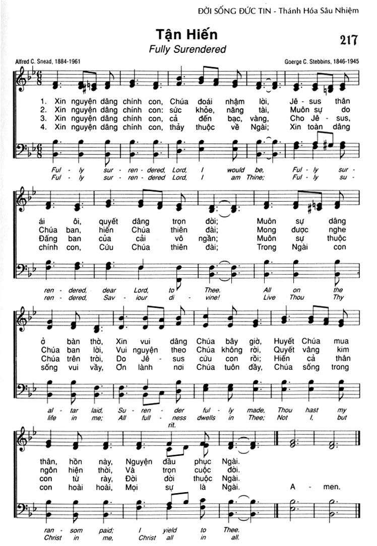1. Xin nguyện dâng chính con, Chúa đoái nhậm lời, Jê-sus thân ái ôi, quyết dâng trọn đời; Muôn sự dâng bàn thờ, Xin vui dâng Chúa bây giờ, Huyết Chúa mua thân, hồn này, Nguyện đầu phục Ngài. 2. Xin nguyện dâng chính con: sức khỏe, năng tài, Muôn sự do Chúa ban, hiến Chúa thiên đài; Mong được nghe Chúa ban lời, Vui nguyện theo Chúa không rời, Quyết vâng kim ngôn hiện thời, Và trọn cuộc đời. 3. Xin nguyện dâng chính con, cả đến vàng bạc, Cho Jê-sus, Đấng ban của cải vô ngần; Muôn sự thuộc Chúa trên trời, Do Jê-sus cứu con rồi; Hiến cả thân con từ rày, Đời đời thuộc Ngài. 4. Xin nguyện dâng chính con, thảy thuộc về Ngài; Xin toàn dâng chính con, Cứu Chúa thiên đài; Trong Ngài con sống vui vầy, Ơn lành nơi Chúa tuôn đầy, Chúa sống trong con hoài hoài, Mọi sự là Ngài. Điệp khúc: Fully surrendered, Lord, I would be. Fully surrendered, dear Lord, to Thee. All on the altar laid, Surrender fully made, Thou hast my ransom paid; I yield to Thee. Fully surrendered Lord, I am Thine; Fully surrendered, Saviour divine! Live Thou Thy life in me; All fullness dwells in Thee; Not I, but Christ in me, Christ all in all. Outro: A - men.