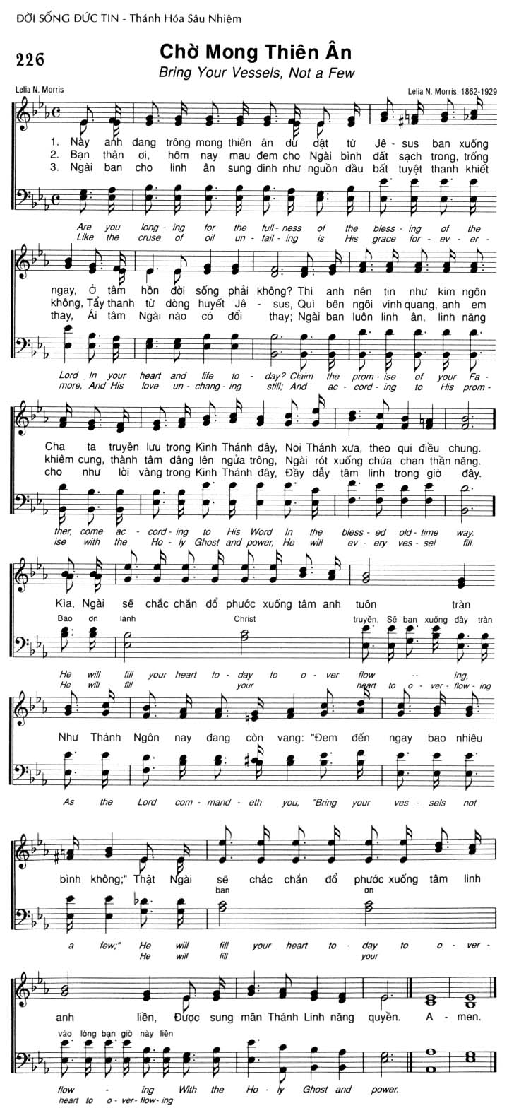 1. Này anh đang trông mong thiên ân dư dật từ Jêsus ban xuống ngay, ở tâm hồn đời sống phải không? Thì anh nên tin như kim ngôn Cha ta truyền lưu trong Kinh Thánh đây, Noi Thánh xưa, theo qui điều chung. Kìa, Ngài sẽ chắc chắn đổ phước xuống tâm anh tuôn tràn anh liền, Được sung mãn Thánh Linh năng quyền. A-men. 2. Bạn thân ơi, hôm nay mau đem cho Ngài bình đất sạch trong, trống không, Tẩy thanh từ dòng huyết Jêsus, Quì bên ngôi vinh quang, anh em khiêm cung, thành tâm dâng lên ngửa trông, Ngài rót xuống chứa chan thần năng. Bao ơn lành Christ truyền, Sẽ ban xuống đầy tràn vào lòng bạn giờ này liên 3. Ngài ban cho linh ân sung dinh như nguồn dầu bất tuyệt thanh khiết thay, Ái tâm Ngài nào có đổi thay; Ngài ban luôn linh ân, linh năng cho như lời vàng trong Kinh Thánh đây, Đầy dẫy tâm linh trong giờ đây. Như Thánh Ngôn nay đang còn vang: "Đem đến ngay bao nhiêu bình không;" Thật Ngài sẽ chắc chắn đổ phước xuống tâm linh