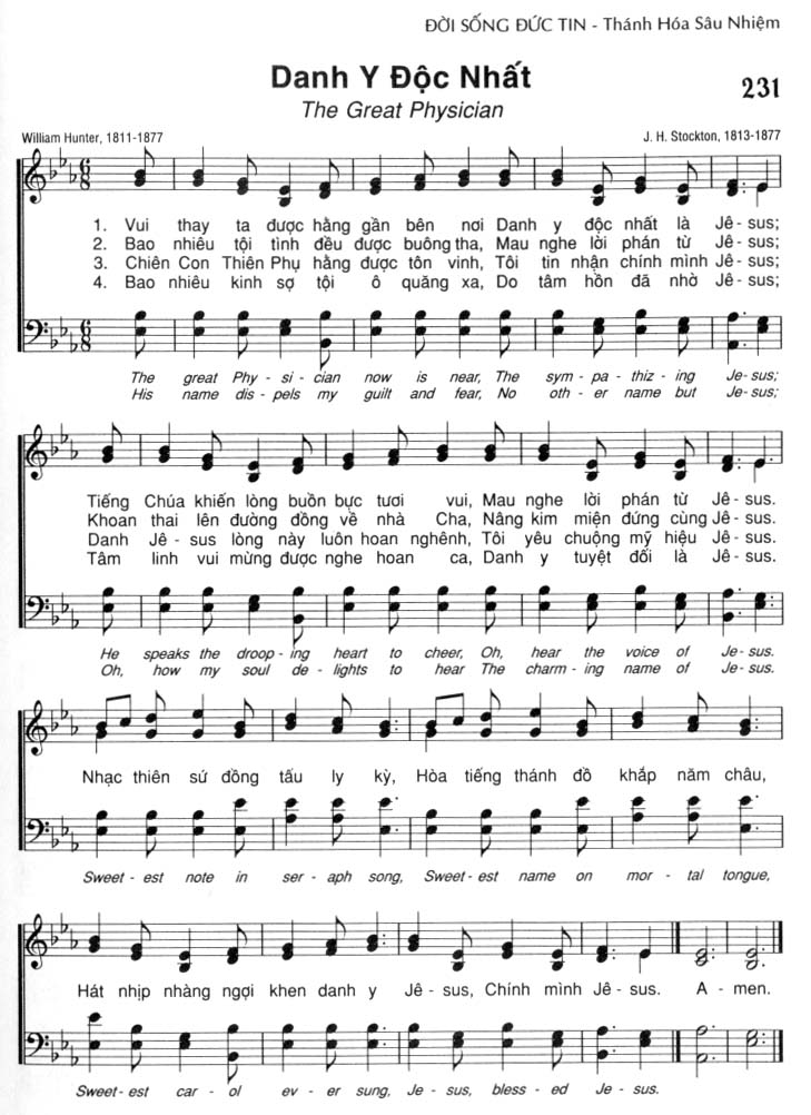 1. Vui thay ta được hằng gần bên nơi Danh y độc nhất là Jê-sus; Tiếng Chúa khiến lòng buồn bực tươi vui, Mau nghe lời phán từ Jê-sus. 2. Bao nhiêu tội tình đều được buông tha, Mau nghe lời phán từ Jê-sus; Khoan thai lên đường đồng về nhà Cha, Nâng kim miện đứng cùng Jê-sus. 3. Chiên Con Thiên Phụ hằng được tôn vinh, Tôi tin nhận chính mình Jê-sus; Danh Jê-sus lòng này luôn hoan nghênh, Tôi yêu chuộng mỹ hiệu Jê-sus. 4. Bao nhiêu kinh sợ tôi ô quăng xa, Do tâm hồn đã nhờ Jê-sus; Tâm linh vui mừng được nghe hoan ca, Danh y tuyệt đối là Jê-sus. Điệp khúc: Nhạc thiên sứ đồng tấu ly kỳ, Hòa tiếng thánh đồ khắp năm châu, Hát nhịp nhàng ngợi khen danh y Jêsus, Chính mình Jê-sus. A men.
