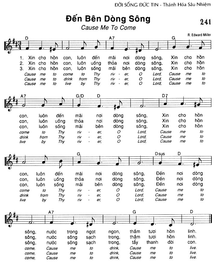 1. Xin cho hồn con, luôn đến mãi nơi dòng sông, Xin cho hồn con, luôn đến mãi nơi dòng sông, Đến nơi dòng sông, nước trong ngọt ngon, thắm tươi hồn linh. 2. Xin cho hồn con, luôn uống thỏa nơi dòng sông, Xin cho hồn con, luôn uống thỏa nơi dòng sông, Đến nơi dòng sông, nước sông sạch trong, thẩm tươi hồn linh. 3. Xin cho hồn con, luôn sống mãi bên dòng sông, Xin cho hồn con, luôn sống mãi bên dòng sông, Đến nơi dòng sông, nước sông sạch trong, tẩy thanh đời con.