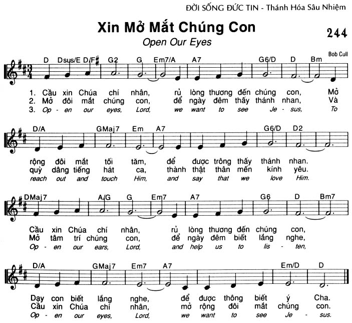 1. Cầu xin Chúa chí nhân, rủ lòng thương đến chúng con, Mở rộng đôi mắt tối tăm, để được trông thấy thánh nhan. Cầu xin Chúa chí nhân, mở rộng đôi mắt chúng con. 2. Mở đôi mắt chúng con, để ngày đêm thấy thánh nhan, Và quỳ dâng tiếng hát ca, thành thật thân mến kính yêu. Mở tâm trí chúng con, để ngày đêm biết lắng nghe, Dạy con biết lắng nghe, để được thông biết ý Cha. 3. Open our eyes, Lord, we want to see Jesus, reach out and touch Him, and say that we love Him. Open our ears, Lord, and help us to listen, Open our eyes, Lord, we want to see Jesus.
