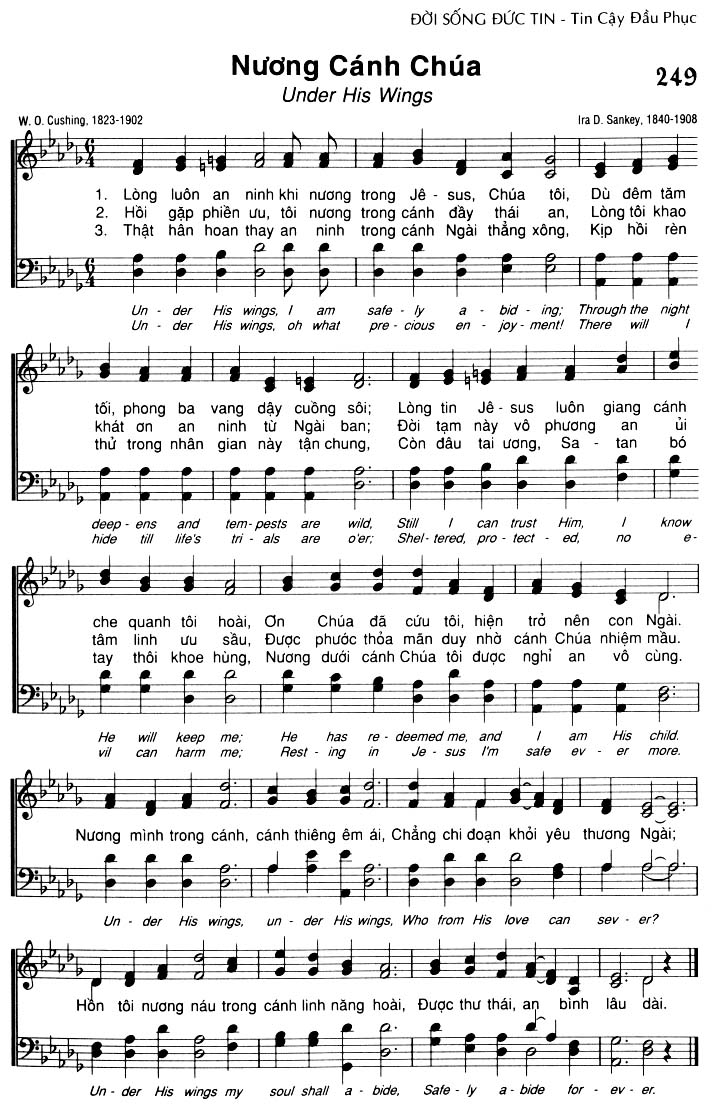 1. Lòng luôn an ninh khi nương trong Jê-sus, Chúa tôi, Dù đêm tăm tối, phong ba vang dậy cuồng sôi; Lòng tin Jê-sus luôn giang cánh che quanh tôi hoài, Ơn Chúa đã cứu tôi, hiện trở nên con Ngài. 2. Hồi gặp phiền ưu, tôi nương trong cánh đầy thái an, Lòng tôi khao khát ơn an ninh từ Ngài ban; Đời tạm này vô phương an ủi tâm linh ưu sầu, Được phước thỏa mãn duy nhờ cánh Chúa nhiệm mầu. 3. Thật hân hoan thay an ninh trong cánh Ngài thẳng xông, Kịp hồi rèn thử trong nhân gian này tận chung, Còn đâu tai ương, Sa-tan bó tay thôi khoe hùng, Nương dưới cánh Chúa tôi được nghỉ an vô cùng. Điệp khúc: Nương mình trong cánh, cánh thiêng êm ái, Chẳng chi đoạn khỏi yêu thương Ngài; Hồn tôi nương náu trong cánh linh năng hoài, Được thư thái, an bình lâu dài.