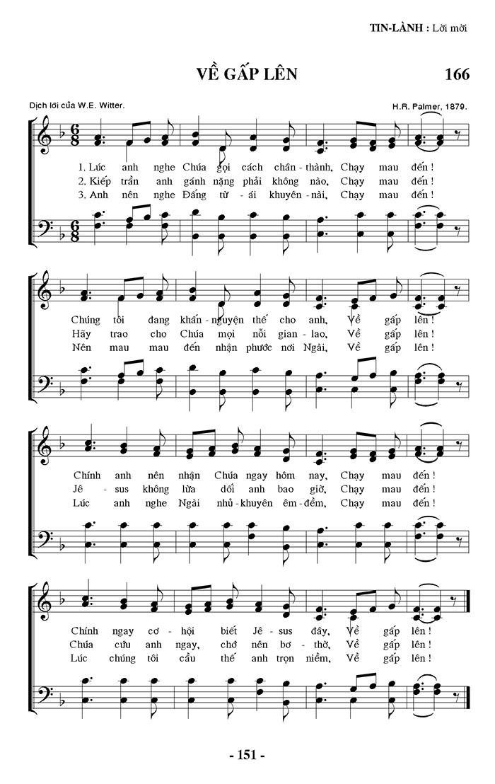 1. Lúc anh nghe Chúa gọi cách chân-thành, Chạy mau đến! Chúng tôi đang khẩn-nguyện thế cho anh, Về gấp lên! Chính anh nên nhận Chúa ngay hôm nay, Chạy mau đến! Chính ngay cơ-hội biết Jê-sus đây, Về gấp lên! 2. Kiếp trần anh gánh nặng phải không nào, Chạy mau đến! Hãy trao cho Chúa mọi nỗi gian-lao, Về gấp lên! Jê-sus không lừa dối anh bao giờ, Chạy mau đến! Chúa cứu anh ngay, chớ nên bơ-thờ, Về gấp lên! 3. Anh nên nghe Đấng từ-ái khuyên-nài, Chạy mau đến! Nên mau mau đến nhận phước nơi Ngài, Về gấp lên! Lúc anh nghe Ngài nhủ-khuyên êm-đềm, Chạy mau đến! Lúc chúng tôi cầu thế anh trọn niềm, Về gấp lên!
