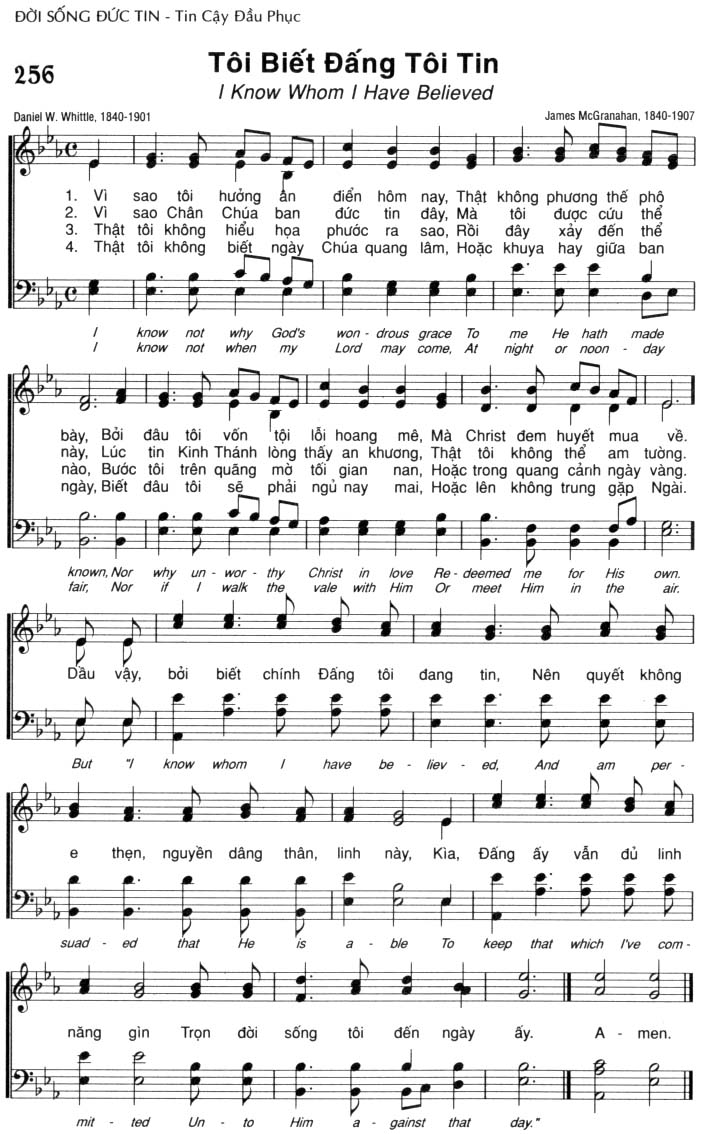 1. Vì sao tôi hưởng ẩn điển hôm nay, Thật không phương thế phô bày, Bởi đâu tôi vốn tội lỗi hoang mê, Mà Christ đem huyết mua về. 2. Vì sao Chân Chúa ban đức tin đây, Mà tôi được cứu thể này, Lúc tin Kinh Thánh lòng thấy an khương, Thật tôi không thể am tường. 3. Thật tôi không hiểu họa phước ra sao, Rồi đây xảy đến thể nào, Bước tôi trên quãng mờ tối gian nan, Hoặc trong quang cảnh ngày vàng. 4. Thật tôi không biết ngày Chúa quang lâm, Hoặc khuya hay giữa ban ngày, Biết đâu tôi sẽ phải ngủ nay mai, Hoặc lên không trung gặp Ngài. Điệp khúc: Dầu vậy, bởi biết chính Đấng tôi đang tin, Nên quyết không thẹn, nguyền dâng thân, linh này, Kìa, Đấng ấy vẫn đủ linh năng gìn Trọn đời sống tôi đến ngày ấy. A-men.