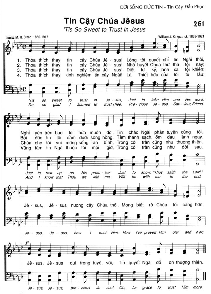 1. Thỏa thích thay tin cậy Chúa Jê-sus! Lòng tôi quyết chỉ tin Ngài thôi, Nghỉ yên trên bao lời hứa muôn đời, Tin chắc Ngài phán tuyên cùng tôi. 2. Thỏa thích thay tin cậy Chúa Jê-sus! Nhờ huyết Chúa thứ tha tội nay; Bởi đức tin tôi dầm dưới sông hồng, Tâm thánh sạch, ốm đau lành ngay. 3. Thỏa thích thay tin cậy Chúa Jê-sus! Diệt tư kỷ, lánh xa tội khiên; Chúa cho tôi vui mừng sống an bình, Trong cõi trần cũng như thượng thiên. 4. Thỏa thích thay kinh nghiệm tin cậy Ngài! Là Thiết hữu của tôi từ lâu; Vững tâm tin Ngài thuộc tôi mọi giờ, Trong cõi trần cũng như đời sau. Điệp khúc: Jê-sus, Jê-sus nương cậy Chúa thôi, Mong biết rõ Chúa tôi càng hơn, Jê-sus, Jê-sus quí trọng tuyệt vời, Tin quyết Ngài đổ ơn thượng thiên.
