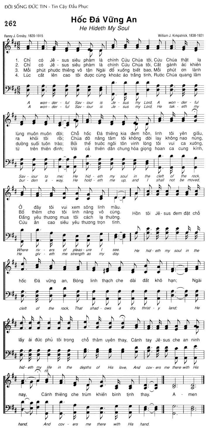 1. Chỉ có Jêsus siêu phàm là chính Cứu Chúa tôi, Cứu Chúa thật là lùng muôn muôn đời; Chỗ hốc Đá thiêng kia đem hồn, linh tôi yên giấu, lấy ái đức phủ tôi trong chỗ thâm uyên thay, Cánh tay Jê-sus che an ninh nay, Cánh thiêng che trùm khiến bình tịnh thay. 2. Chỉ có Jêsus siêu phàm là chính Cứu Chúa tôi, Cất gánh ác khiên ra khỏi tôi rồi; Chúa đỡ nâng tâm tôi không dời lay không nao núng, lấy ái đức phủ tôi trong chỗ thâm uyên thay, Cánh tay Jê-sus che an ninh nay, Cánh thiêng che trùm khiến bình tịnh thay. 3. Mỗi phút phước thiêng vô tận Ngài đổ xuống biết bao, Mỗi phút ơn lành dường suối tuôn trào; Bởi thế trước ngôi tôn vinh lòng tôi vui ca xướng, lấy ái đức phủ tôi trong chỗ thâm uyên thay, Cánh tay Jê-sus che an ninh nay, Cánh thiêng che trùm khiến bình tịnh thay. 4. Lúc cất lên cao tôi được cùng khoác áo trắng tinh, Rước Chúa quang lâm từ trên thiên đình; Với cả thiên dân chung hòa giọng hoan ca cung kính, lấy ái đức phủ tôi trong chỗ thâm uyên thay, Cánh tay Jê-sus che an ninh nay, Cánh thiêng che trùm khiến bình tịnh thay. Điệp khúc: Ở đây tôi vui xem sông linh mầu. Bổ thêm cho tôi linh năng vô cùng. Hồn tôi Jêsus đem đặt chỗ hốc Đá vững an, Bóng linh thạch che dài đất khô hạn; Đấng yêu thương mua tôi cách lạ thường. Cứu ân cao siêu yêu thương trọn tình. Outro: A-men