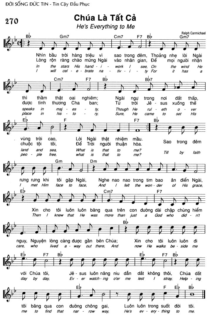 1. Nhìn bầu trời hàng triệu vì sao trong đêm, Thoảng nhẹ lời Ngài thì thầm thật oai nghiêm; Ngài ngự trong nơi đất thấp, vùng trời cao, Lời Ngài thật nhiệm mầu. Sao trong đêm rưng rưng khi tôi gặp Ngài, Nghe nao nao trong tim bao ân điển Ngài, Xin cho tôi luôn luôn băng qua trên con đường dài chập chùng hiểm nguy, Nguyện lòng càng được gần bên Chúa; Xin cho tôi luôn luôn đi với Chúa tôi, Jê-sus luôn nâng niu dẫn dắt không thôi, Chúa dắt tôi băng qua con đường chông gai, Luôn luôn trong suốt đời tôi. 2. Lòng rộn ràng chào mừng Ngài vào nhân gian, Để mọi người nhận được tình thương Cha ban; Từ trời Jê-sus xuống thế, chuộc tội tôi, Để Trời người thuận hòa. What is that to me? And I felt the wonder of His grace, Then I knew that He was more than just a God who didn't care, who lived a way out there, And now He walks beside me day by day, Ever watching o'er me lest I stray, Helping me to find that narrow way, He's everything to me. 3. In the stars His handiwork I see, On the wind He speaks in majesty, Though He ruleth over land and sea, What is that to me? Sure, He came to set His people free, What is that to me? Till by faith I met Him face to face, And I felt the wonder of His grace, Then I knew that He was more than just a God who didn't care, who lived a way out there, And now He walks beside me day by day, Ever watching o'er me lest I stray, Helping me to find that narrow way, He's everything to me.