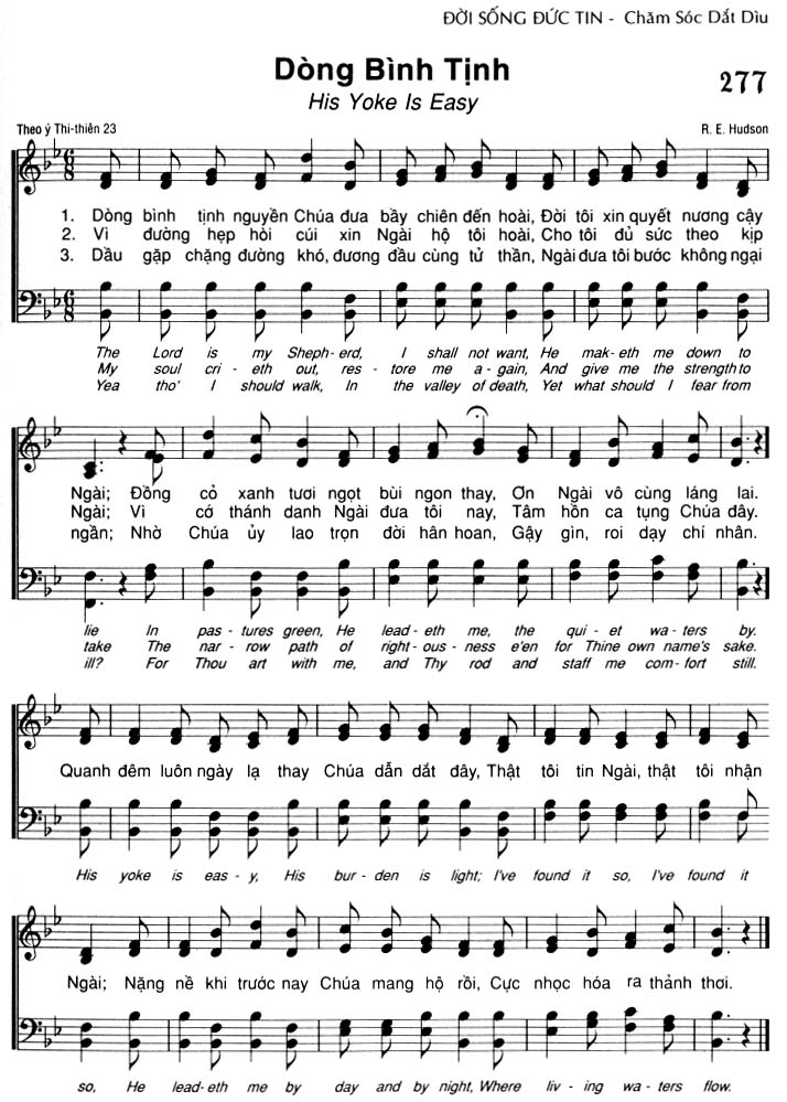 1. Dòng bình tịnh nguyền Chúa đưa bầy chiên đến hoài, Đời tôi xin quyết nương cậy Ngài; Đồng cỏ xanh tươi ngọt bùi ngon thay, Ơn Ngài vô cùng láng lai. 2. Vì đường hẹp hòi cúi xin Ngài hộ tôi hoài, Cho tôi đủ sức theo kịp Ngài; Vì có thánh danh Ngài đưa tôi nay, Tâm hồn ca tụng Chúa đây. 3. Dầu gặp chặng đường khó, đương đầu cùng tử thần, Ngài đưa tôi bước không ngại ngần; Nhờ Chúa ủy lao trọn đời hân hoan, Gậy gìn, roi dạy chí nhân. Điệp khúc: Quanh đêm luôn ngày lạ thay Chúa dẫn dắt đây, Thật tôi tin Ngài, thật tôi nhận Ngài; Nặng nề khi trước nay Chúa mang hộ rồi, Cực nhọc hóa ra thảnh thơi.