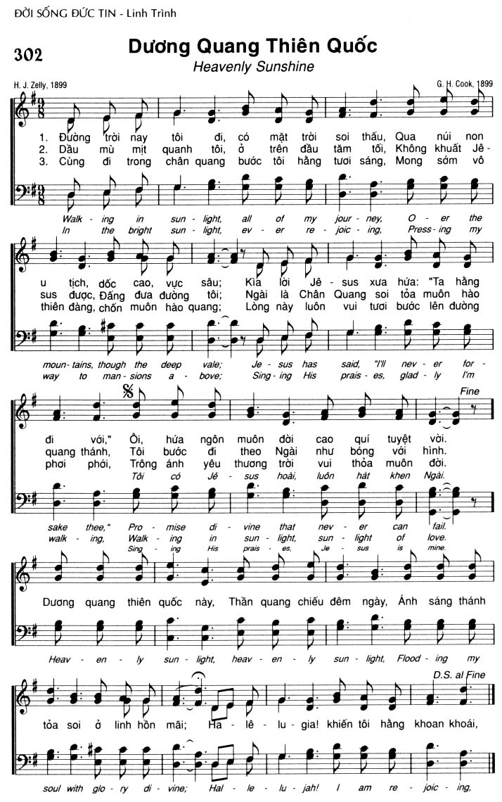 1. Đường trời nay tôi đi, có mặt trời soi thấu, Qua núi non u tịch, dốc cao, vực sâu; Kia lời Jê-sus xưa hứa: "Ta hằng di với," Ôi, hứa ngôn muôn đời cao quí tuyệt vời. 2. Dầu mù mịt quanh tôi, ở trên đầu tăm tối, Không khuất Jê-sus được, Đấng đưa đường tôi; Ngài là Chân Quang soi tỏa muôn hào quang thánh, Tôi bước đi theo Ngài như bóng với hình. 3. Cùng đi trong chân quang bước tôi hằng tươi sáng, Mong sớm vô thiên đàng, chốn muôn hào quang; Lòng này luôn vui tươi bước lên đường phơi phới, Trông ánh yêu thương trời vui thỏa muôn đời. Tôi có Jê-sus hoài, luôn hát khen Ngài. Điệp khúc: Dương quang thiên quốc này, Thần quang chiếu đêm ngày, Ánh sáng thánh tỏa soi ở linh hồn mãi; Ha-lê-lu-gia! khiến tôi hằng khoan khoái,