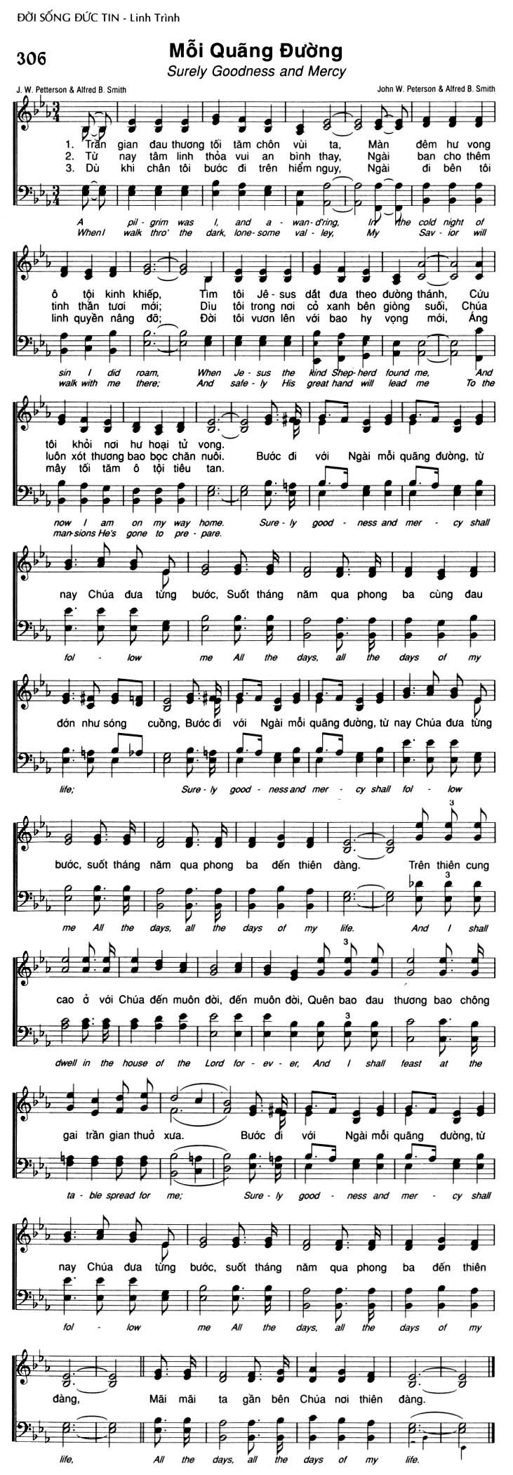 1. Trần gian đau thương tối tăm chôn vùi ta, Màn đêm hư vong tội kinh khiếp, Tim tôi Jêsus dắt đưa theo đường thánh, Cứu tôi khỏi nơi hư hoại tử vong. 2. Từ nay tâm linh thỏa vui an bình thay, Ngài ban cho thêm tinh thần tươi mới; Dìu tôi trong nơi cỏ xanh bên giòng suối, Chúa luôn xót thương bao bọc chăn nuôi. 3. Dù khi chân tôi bước đi trên hiểm nguy, Ngài đi bên tôi linh quyền nâng đỡ; Đời tôi vươn lên với bao hy vọng mới, Áng mây tối tăm ô tội tiêu tan. Điệp khúc: Bước đi với Ngài mỗi quãng đường, từ nay Chúa đưa từng bước, Suốt tháng năm qua phong ba cùng đau đớn như sóng cuồng, Bước đi với Ngài mỗi quãng đường, từ nay Chúa đưa từng bước, suốt tháng năm qua phong ba đến thiên đàng. Trên thiên cung cao ở với Chúa đến muôn đời, đến muôn đời, Quên bao đau thương bao chông gai trần gian thuở xưa. Bước đi với Ngài mỗi quãng đường, từ nay Chúa đưa từng bước, suốt tháng năm qua phong ba đến thiên đàng, Mãi mãi ta gần bên Chúa nơi thiên đàng.