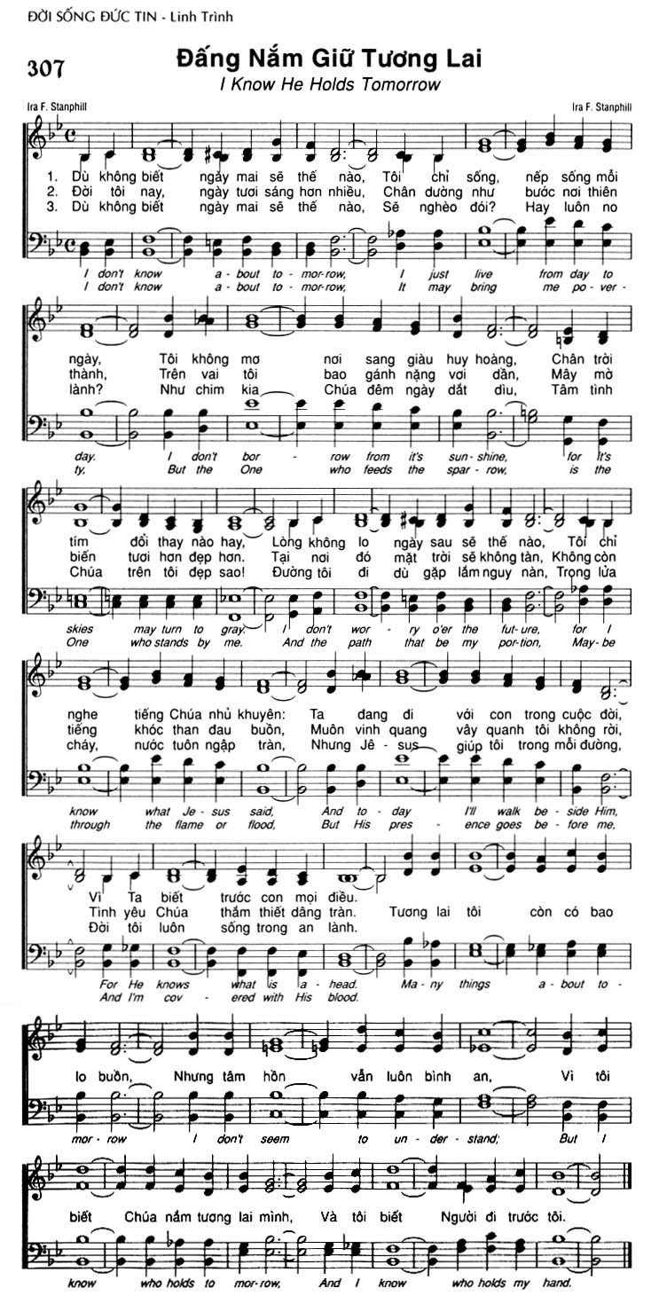 1. Dù không biết ngày mai sẽ thế nào, Tôi chỉ sống, nếp sống mỗi ngày, Tôi không mơ nơi sang giàu huy hoàng, Chân trời tím đổi thay nào hay, Lòng không lo ngày sau sẽ thế nào, Tôi chỉ nghe tiếng Chúa nhủ khuyên: Ta đang đi với con trong cuộc đời, Vì Ta biết trước con mọi điều. 2. Đời tôi nay, ngày tươi sáng hơn nhiều, Chân dường như bước nơi thiên thành, Trên vai tôi bao gánh nặng với dần, Mây mờ biến tươi hơn đẹp hơn. Tại nơi đó mặt trời sẽ không tàn, Không còn tiếng khóc than đau buồn, Muôn vinh quang vây quanh tôi không rời, Tình yêu Chúa thắm thiết dâng tràn. 3. Dù không biết ngày mai sẽ thế nào, Sẽ nghèo đói? Hay luôn no lành? Như chim kia Chúa đêm ngày dắt dìu, Tâm tình Chúa trên tôi đẹp sao! Đường tôi đi dù gặp lắm nguy nàn, Trọng lửa cháy, nước tuôn ngập tràn, Nhưng Jê-sus giúp tôi trong mỗi đường, Đời tôi luôn sống trong an lành. Điệp khúc: Tương lai tôi còn có bao lo buồn, Nhưng tâm hồn vẫn luôn bình an, Vì tôi biết Chúa nắm tương lai mình, Và tôi biết Người đi trước tôi.