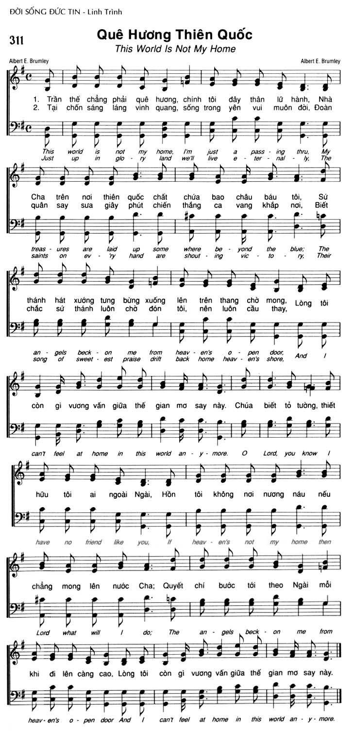 1. Trần thế chẳng phải quê hương, chính tôi đây thân lữ hành, Nhà Cha trên nơi thiên quốc chất chứa bao châu báu tôi, Sứ thánh hát xướng tưng bừng xuống lên trên thang chờ mong, Lòng tôi còn gì vương vấn giữa thế gian mơ say này. Chúa biết tỏ tường, thiết hữu tôi ai ngoài Ngài, Hồn tôi không nơi nương náu nếu chẳng mong lên nước Cha; Quyết chí bước tới theo Ngài mỗi khi đi lên càng cao, Lòng tôi còn gì vương vấn giữa thế gian mơ say này. 2. Tại chốn sáng láng vinh quang, sống trong yên vui muôn đời, Đoàn quân say sưa giây phút chiến thắng ca vang khắp nơi, Biết chắc sứ thánh luôn chờ đón tôi, nên luôn cầu thay, Lòng tôi còn gì vương vấn giữa thế gian mơ say này. Chúa biết tỏ tường, thiết hữu tôi ai ngoài Ngài, Hồn tôi không nơi nương náu nếu chẳng mong lên nước Cha; Quyết chí bước tới theo Ngài mỗi khi đi lên càng cao, Lòng tôi còn gì vương vấn giữa thế gian mơ say này. Điệp khúc: This world is not my home, I'm just a passing thru. My treasures are laid up somewhere beyond the blue; The angels beckon me from heaven's open door, And I can't feel at home in this world any more. Just up in glory land we'll live eternal ly. The saints on every hand are shouting victory. Their song of sweetest praise drift back home heaven's shore. O Lord, you know I have no friend like you, If heaven's not my home then Lord what will I do; The angels beckon me from heaven's open door And I can't feel at home in this world any more.