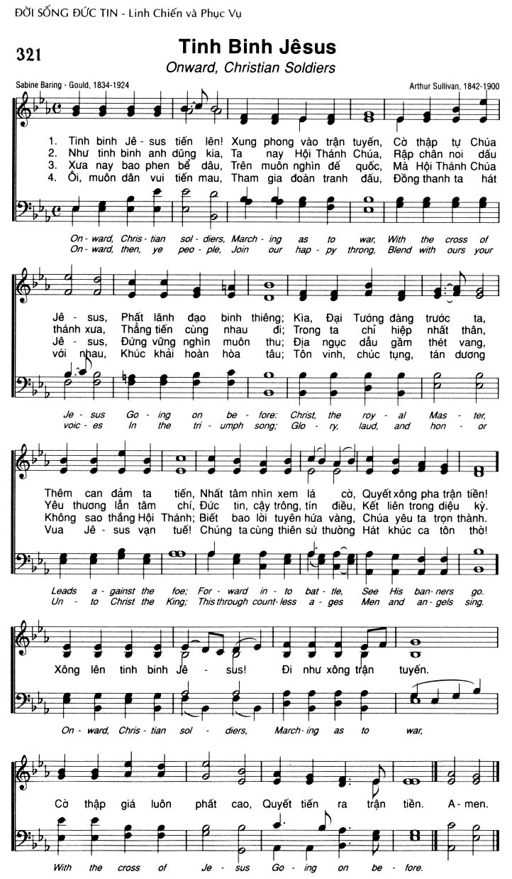 1. Tinh binh Jêsus tiến lên! Xung phong vào trận tuyến, Cờ thập tự Chúa Jêsus, Phất lãnh đạo binh thiêng; Kìa, Đại Tướng đàng trước ta, Thêm can đảm ta tiến, Nhất tâm nhìn xem lá cờ, Quyết xông pha trận tiền! 2. Như tinh binh anh dũng kia, Ta nay Hội Thánh Chúa, Rập chân noi dấu thánh xưa, Thẳng tiến cùng nhau đi; Trong ta chỉ hiệp nhất thân, Yêu thương lẫn tâm chí, Đức tin, cậy trông, tín điều, Kết liên trong diệu kỳ. 3. Xưa nay bao phen bể dâu, Trên muôn nghìn đế quốc, Mà Hội Thánh Chúa Jêsus, Đứng vững nghìn muôn thu; Địa ngục dẫu gầm thét vang, Không sao thắng Hội Thánh; Biết bao lời tuyên hứa vàng, Chúa yêu ta trọn thành. 4. Ôi, muôn dân vui tiến mau, Tham gia đoàn tranh đấu, Đồng thanh ta hát với nhau, Khúc khải hoàn hòa tấu: Tôn vinh, chúc tụng, tán dương Vua Jêsus vạn tuế! Chúng ta cùng thiên sứ thường Hát khúc ca tôn thờ! Điệp khúc: Xông lên tinh binh Jêsus! Đi như xông trận tuyến. Cờ thập giá luôn phất cao, Quyết tiến ra trận tiền. A-men.