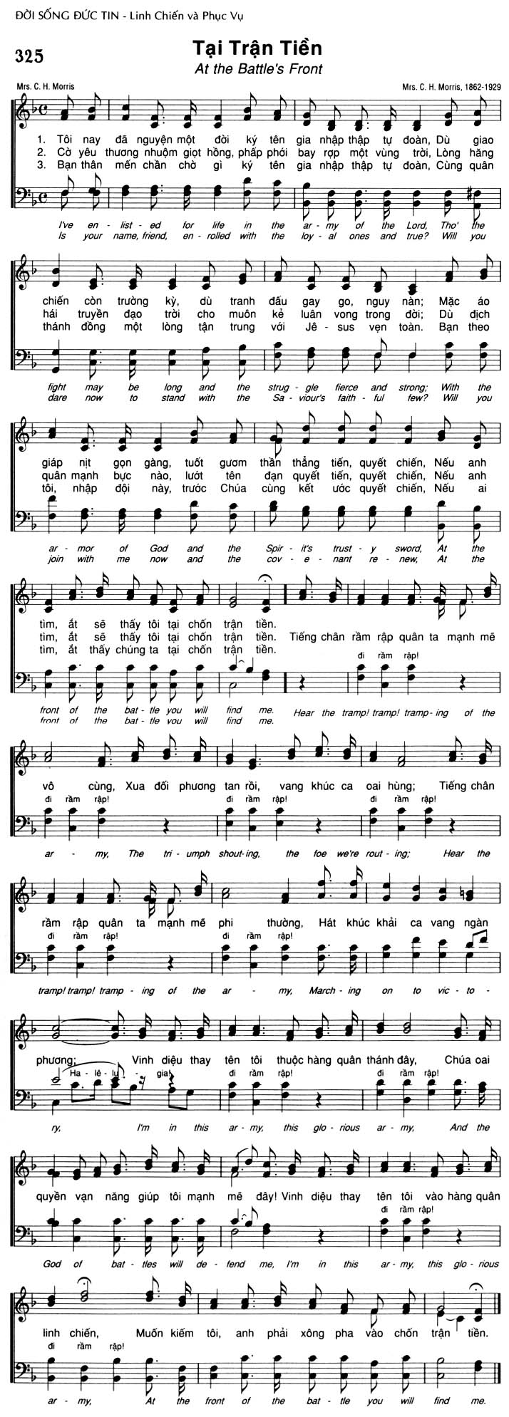1. Tôi nay đã nguyện một đời ký tên gia nhập thập tự đoàn, Dù giao chiến còn trường kỳ, dù tranh đấu gay go, nguy nàn; Mặc áo giáp nịt gọn gàng, tuốt gươm thần thẳng tiến, quyết chiến, Nếu anh tìm, ắt sẽ thấy tôi tại chốn trận tiền. 2. Cờ yêu thương nhuộm giọt hồng, phấp phới bay rợp một vùng trời, Lòng hăng hái truyền đạo trời cho muôn kẻ luân vong trong đời; Dù địch quân mạnh bực nào, lướt tên đạn quyết tiến, quyết chiến, Nếu anh tìm, ắt sẽ thấy tôi tại chốn trận tiền. 3. Bạn thân mến chần chờ gì ký tên gia nhập thập tự đoàn, Cùng quân thánh đồng một lòng tận trung với Jê-sus vẹn toàn. Bạn theo tôi, nhập đội này, trước Chúa cùng kết ước quyết chiến, Nếu ai tìm, ắt thấy chúng ta tại chốn trận tiền. Điệp khúc: Tiếng chân rầm rập quân ta mạnh mẽ vô cùng, Xua đối phương tan rồi, vang khúc ca oai hùng; Tiếng chân rầm rập quân ta mạnh mẽ phi thường, Hát khúc khải ca vang ngàn phương; Vinh diệu thay tên tôi thuộc hàng quân thánh đây, Chúa oai quyền vạn năng giúp tôi mạnh mẽ đây! Vinh diệu thay tên tôi vào hàng quân linh chiến, Muốn kiếm tôi, anh phải xông pha vào chốn trận tiền.