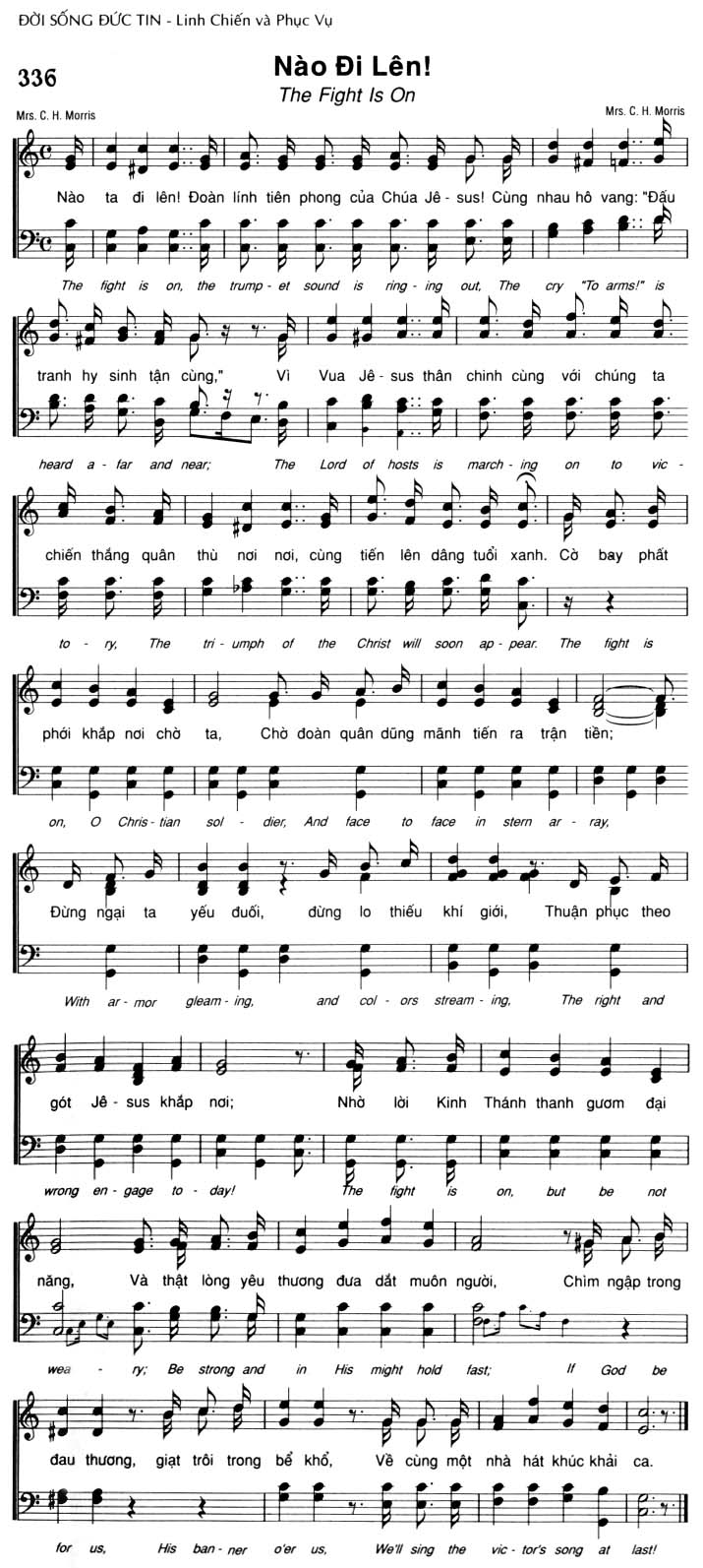 1. Nào ta đi lên! Đoàn lính tiên phong của Chúa Jêsus! Cùng nhau hô vang: "Đấu tranh hy sinh tận cùng," Vì Vua Jêsus thân chinh cùng với chúng ta chiến thắng quân thù nơi nơi, cùng tiến lên dâng tuổi xanh. Cờ bay phất phới khắp nơi chờ ta, Chờ đoàn quân dũng mãnh tiến ra trận tiền; Đừng ngại ta yếu đuối, đừng lo thiếu khí giới, Thuận phục theo gót Jêsus khắp nơi; Nhờ lời Kinh Thánh thanh gươm đại năng, Và thật lòng yêu thương đưa dắt muôn người, đau thương, giạt trôi trong bể khổ, Về cùng một nhà hát khúc khải ca. 2. Nào ta đi lên! Đoàn lính tiên phong của Chúa Jêsus! Cùng nhau hô vang: "Đấu tranh hy sinh tận cùng," Vì Vua Jêsus thân chinh cùng với chúng ta chiến thắng quân thù nơi nơi, cùng tiến lên dâng tuổi xanh. Cờ bay phất phới khắp nơi chờ ta, Chờ đoàn quân dũng mãnh tiến ra trận tiền; Đừng ngại ta yếu đuối, đừng lo thiếu khí giới, Thuận phục theo gót Jêsus khắp nơi; Nhờ lời Kinh Thánh thanh gươm đại năng, Và thật lòng yêu thương đưa dắt muôn người, đau thương, giạt trôi trong bể khổ, Về cùng một nhà hát khúc khải ca. 3. Nào ta đi lên! Đoàn lính tiên phong của Chúa Jêsus! Cùng nhau hô vang: "Đấu tranh hy sinh tận cùng," Vì Vua Jêsus thân chinh cùng với chúng ta chiến thắng quân thù nơi nơi, cùng tiến lên dâng tuổi xanh. Cờ bay phất phới khắp nơi chờ ta, Chờ đoàn quân dũng mãnh tiến ra trận tiền; Đừng ngại ta yếu đuối, đừng lo thiếu khí giới, Thuận phục theo gót Jêsus khắp nơi; Nhờ lời Kinh Thánh thanh gươm đại năng, Và thật lòng yêu thương đưa dắt muôn người, đau thương, giạt trôi trong bể khổ, Về cùng một nhà hát khúc khải ca.
