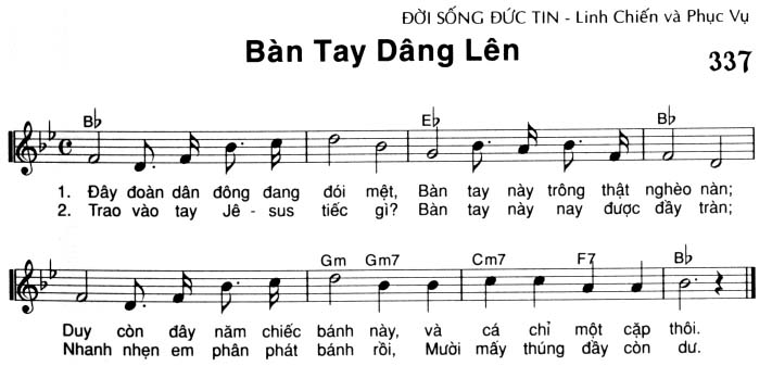 1. Đây đoàn dân đông đang đói mệt, Bàn tay này trông thật nghèo nàn; Duy còn đây năm chiếc bánh này, và cá chỉ một cặp thôi. 2. Trao vào tay Jê-sus tiếc gì? Bàn tay này nay được đầy tràn; Nhanh nhẹn em phân phát bánh rồi, Mười mấy thùng đầy còn dư.