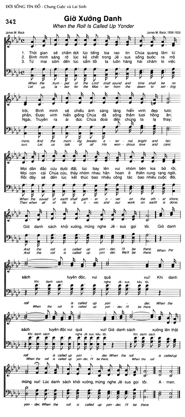 1. Thời gian sẽ chấm dứt lúc tiếng loa rao tin Chúa quang lâm từ trời, Bình minh sẽ chiếu ánh sáng láng hiển vinh đẹp tươi; Mọi dân đắc cứu dưới đất, lúc bay lên vui nhóm bên kia bờ rồi, 2. Bình minh sáng rỡ lúc kẻ chết trong Jê-sus sống bước ra mộ phần, Được vinh hiển giống Chúa đã sống thắm tươi hồng ân; Mọi con cái Chúa cứu, thảy nhóm nhau hân hoan ở thiên cung rạng ngời, 3. Từ mai sớm đến lúc sẩm tối ta luôn hăng hái chăm lo việc Ngài, Truyền ra ái đức Chúa đoái đến chúng ta lạ thay: Rồi đây sẽ đến lúc kết thúc bao nhiêu công tác bao nhiêu cuộc đời, Điệp khúc: Giờ danh sách khởi xướng, mừng nghe Jê-sus gọi tôi. Giờ danh sách tuyên độc, vui quá vui! Khi danh sách xướng lên thật mừng vui! Lúc danh sách khởi xướng, mừng nghe Jê-sus gọi tôi. A-men.