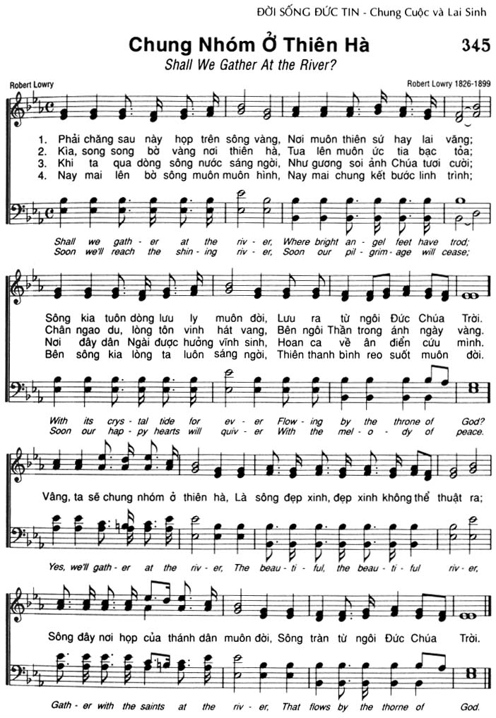 1. Phải chăng sau này họp trên sông vàng, Nơi muôn thiên sứ hay lai văng; Sông kia tuôn dòng lưu ly muôn đời, Lưu ra từ ngôi Đức Chúa Trời. 2. Kìa, song song bờ vàng nơi thiên hà, Tua lên muôn ức tia bạc tỏa; Chân ngao du, lòng tôn vinh hát vang, Bên ngôi Thần trong ánh ngày vàng. 3. Khi ta qua dòng sông nước sáng ngời, Như gương soi ảnh Chúa tươi cười; Nơi đây dân Ngài được hưởng vĩnh sinh, Hoan ca về ân điển cứu mình. 4. Nay mai lên bờ sông muôn muôn hình, Nay mai chung kết bước linh trình; Bên sông kia lòng ta luôn sáng ngời, Thiên thanh bình reo suốt muôn đời. Điệp khúc: Vâng, ta sẽ chung nhóm ở thiên hà, Là sông đẹp xinh, đẹp xinh không thể thuật ra; Sông đây nơi họp của thánh dân muôn đời, Sông tràn từ ngôi Đức Chúa Trời.