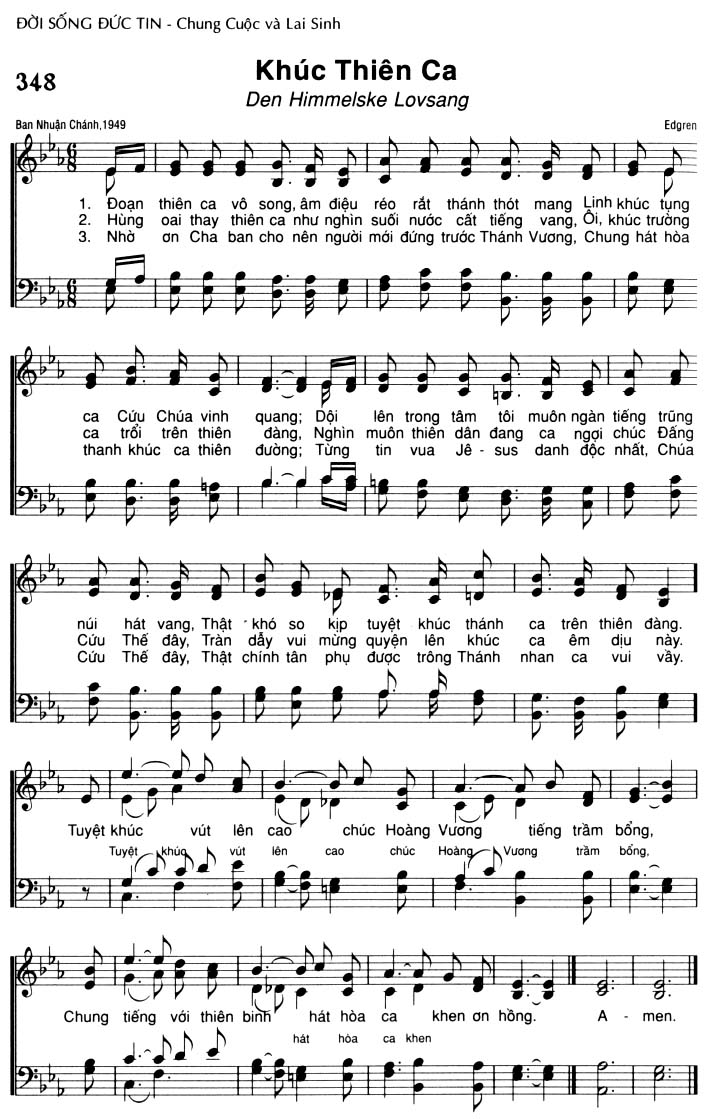 1. Đoạn thiên ca vô song, âm điệu réo rắt thánh thót mang Linh khúc tụng ca Cứu Chúa vinh quang; Dội lên trong tâm tôi muôn ngàn tiếng trũng núi hát vang, Thật khó so kịp tuyệt khúc thánh ca trên thiên đàng. Tuyệt khúc vút lên cao chúc Hoàng Vương tiếng trầm bổng, Chung tiếng với thiên bình hát hòa ca khen ơn hồng. A - men. 2. Hùng oai thay thiên ca như nghìn suối nước cất tiếng vang, Ôi, khúc trường ca trổi trên thiên đàng, Nghìn muôn thiên dân đang ca ngợi chúc Đấng Cứu Thế đây, Tràn dầy vui mừng quyện lên khúc ca êm dịu này. Tuyệt khúc vút lên cao chúc Hoàng Vương trầm bổng, hát hòa ca khen. 3. Nhờ ơn Cha ban cho nên người mới đứng trước Thánh Vương, Chung hát hòa thanh khúc ca thiên đường; Từng tin vua Jê-sus danh độc nhất, Chúa Cứu Thế đây, Thật chính tân phụ được trông Thánh nhan ca vui vầy. Tuyệt khúc vút lên cao chúc Hoàng Vương tiếng trầm bổng, Chung tiếng với thiên bình hát hòa ca khen ơn hồng. A - men.