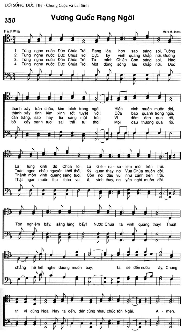 1. Từng nghe nước Đức Chúa Trời, Rạng lòa hơn sao sáng soi, Tường thành xây trân châu, kim bích trong ngời; Hiển vinh muôn muôn đời, Lạ lùng kinh đô Chúa tôi, Là Giê-ru-sa-lem mới trên trời. Tôn nghiêm bấy, sáng láng bấy! Nước Chúa ta vinh quang thay! Thuật chẳng hề hết nghe dường muốn bay; Ta sẽ đến nước ấy, Chung trị vì cùng Ngài, Này ta đến, đến cùng nhau chúc tôn Ngài. 2. Từng nghe nước Đức Chúa Trời, Cực kỳ vinh quang khắp nơi, Đường thành xây tinh kim xinh tốt tuyệt vời; Cửa bao quanh trong ngời, Toàn ngọc châu nguyên khối thôi, Kỳ quan thay nơi Vua Chúa muôn đời. Tôn nghiêm bấy, sáng láng bấy! Nước Chúa ta vinh quang thay! Thuật chẳng hề hết nghe dường muốn bay; Ta sẽ đến nước ấy, Chung trị vì cùng Ngài, Này ta đến, đến cùng nhau chúc tôn Ngài. 3. Từng nghe nước Đức Chúa Trời, Tự mình Chiên Con sáng soi, Nào cần trăng, sao hay tia sáng mặt trời; Vì đêm đen qua rồi, Thành môn vinh quang sáng tươi, Còn nơi đâu vui như cảnh trên trời. Tôn nghiêm bấy, sáng láng bấy! Nước Chúa ta vinh quang thay! Thuật chẳng hề hết nghe dường muốn bay; Ta sẽ đến nước ấy, Chung trị vì cùng Ngài, Này ta đến, đến cùng nhau chúc tôn Ngài. 4. Từng nghe nước Đức Chúa Trời, Một dòng sông lưu khắp nơi, Dọc bờ cây xanh tươi sai trái tư thời; Mọi đau thương qua rồi, Thật ngàn muôn thu thỏa vui, à, vinh thay, nơi yên nghỉ muôn đời. Tôn nghiêm bấy, sáng láng bấy! Nước Chúa ta vinh quang thay! Thuật chẳng hề hết nghe dường muốn bay; Ta sẽ đến nước ấy, Chung trị vì cùng Ngài, Này ta đến, đến cùng nhau chúc tôn Ngài. Outro: A - men.