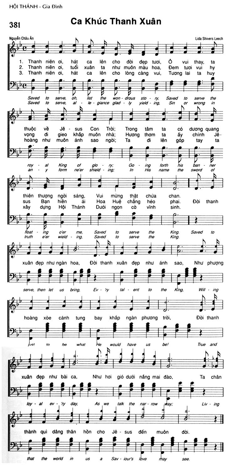 1. Thanh niên ơi, hát ca lên cho đời đẹp tươi, Ô vui thay, ta thuộc về Jê-sus Con Trời; Trong tâm ta có dương quang thiên thượng ngời sáng, Vui mừng thật chứa chan. Đời thanh xuân đẹp như ngàn hoa, hoàng xòe cánh tung bay khắp ngàn phương trời, xuân đẹp như bài ca, thành quì dâng thân hồn cho Jê-sus đến muôn đời. 2. Thanh niên ơi, tuổi xuân ta như muôn màu hoa, Đem tươi vui hy vọng đi gieo khắp muôn nhà; Hương thơm ta chính Jê-sus Bạn hiền ái Hoa Huệ chẳng héo phai. Đời thanh xuân đẹp như ánh sao, Như phượng xuân đẹp như bài ca, Như hơi gió dưới nắng mai đào, Ta chân thành quì dâng thân hồn cho Jê-sus đến muôn đời. 3. Thanh niên ơi, hát ca lên cho lòng càng vui, Tương lai ta huy hoàng như muôn ánh sao ngời; Ta đi lên góp tay ta xây dựng Hội Thánh Dưới ngọn cờ vĩnh sinh. Đời thanh xuân đẹp như ngàn hoa, hoàng xòe cánh tung bay khắp ngàn phương trời, xuân đẹp như bài ca, thành quì dâng thân hồn cho Jê-sus đến muôn đời. Điệp khúc: Saved to serve, oh, list the wondrous story. Saved to serve the royal King of glory: Going forth his banner float-ing o'er me, Saved to serve the King. Saved to serve, allegiance gladly yield-ing, Sin or wrong in any form ne'er shield-ing; In His name the sword of truth e'er wield-ing, Saved to serve the King. serve, then let us bring. Ev-'ry talent to the King. Will-ing just to be what He would have us be! True and loy-al ev-'ry day, As we talk the nar-row way: Liv-ing that the world in us a Saviour's love may see.
