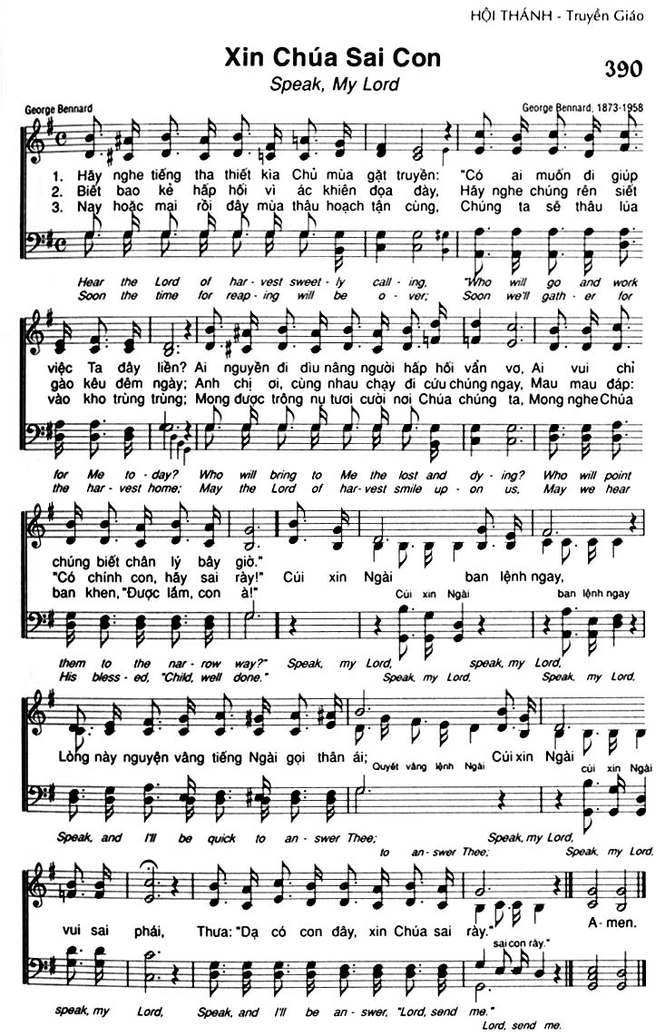 1. Hãy nghe tiếng tha thiết kìa Chủ mùa gặt truyền: "Có ai muốn đi giúp việc Ta đây liền? Ai nguyền đi dìu nâng người hấp hối vẩn vơ. Ai vui chi chúng biết chân lý bây giờ." Lòng này nguyện vâng tiếng Ngài gọi thân ái; vui sai phái, Thưa: "Dạ có con đây, xin Chúa sai rày." 2. Biết bao kẻ hấp hối vì ác khiên đọa đày, Hãy nghe chúng rên siết gào kêu đêm ngày; Anh chị ơi, cùng nhau chạy đi cứu chúng ngay, Mau mau đáp: "Có chính con, hãy sai rày!" Cúi xin Ngài ban lệnh ngay, Cúi xin Ngài ban lệnh ngay, Quyết vâng lệnh Ngài Cúi xin Ngài cúi xin Ngài vui sai phái, Thưa: "Dạ có con đây, xin Chúa sai rày." 3. Nay hoặc mai rồi đây mùa thâu hoạch tận cùng. Chúng ta sẽ thâu lúa vào kho trùng trùng; Mong được trông nụ tươi cười nơi Chúa chúng ta, Mong nghe Chúa ban khen, "Được lắm, con à!" Lòng này nguyện vâng tiếng Ngài gọi thân ái; vui sai phái, Thưa: "Dạ có con đây, xin Chúa sai rày."