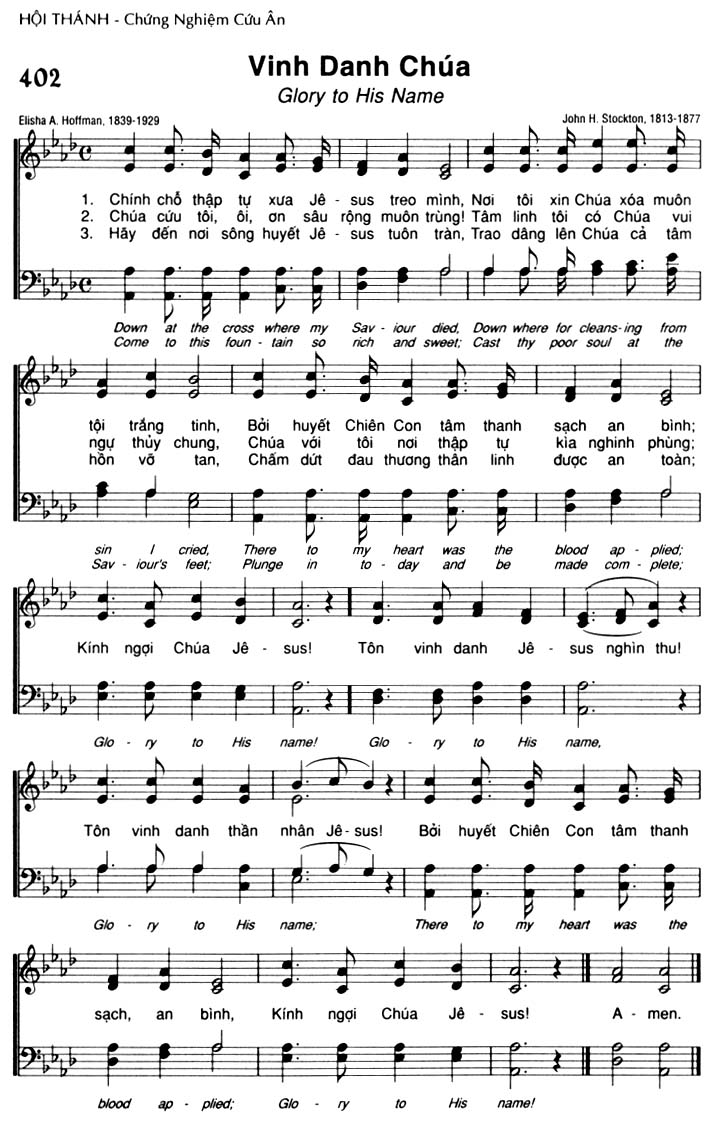 1. Chính chỗ thập tự xưa Jê-sus treo mình, Nơi tôi xin Chúa xóa muôn tội trắng tinh, Bởi huyết Chiên Con tâm thanh sạch an bình; 2. Chúa cứu tôi, ôi, ơn sâu rộng muôn trùng! Tâm linh tôi có Chúa vui ngự thủy chung, Chúa với tôi nơi thập tự kìa nghinh phùng; 3. Hãy đến nơi sông huyết Jê-sus tuôn tràn, Trao dâng lên Chúa cả tâm hồn vô tan, Chấm dứt đau thương thân linh được an toàn; Điệp khúc: Kính ngợi Chúa Jê-sus! Tôn vinh danh Jê-sus nghìn thu! Tôn vinh danh thần nhân Jê-sus! Kính ngợi Chúa Jê-sus! A-men.