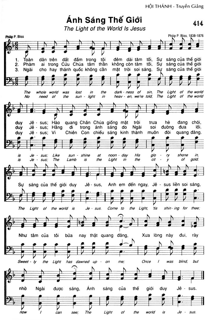 1. Toàn dân trên đất đắm trong tội đêm dài tăm tối, Sự sáng của thế giới duy Jêsus; Hào quang Chân Chúa giống mặt trời trưa hè đang chói, Sự sáng của thế giới duy Jêsus, Anh em đến ngay, Jêsus liền soi sáng, Như tâm của tôi bữa nay thật quang đãng, Xưa lòng này đui, rày nhờ Ngài được sáng, Ánh sáng của thế giới duy Jêsus. 2. Phàm ai trong Cứu Chúa tâm thần không còn tăm tối, Sự sáng của thế giới duy Jêsus; Hằng đi trong ánh sáng do Ngài soi đường đưa lối, Sự sáng của thế giới duy Jêsus, Anh em đến ngay, Jêsus liền soi sáng, Như tâm của tôi bữa nay thật quang đãng, Xưa lòng này đui, rày nhờ Ngài được sáng, Ánh sáng của thế giới duy Jêsus. 3. Ngài cho hay thánh quốc không cần mặt trời soi sáng, Sự sáng của thế giới duy Jêsus; Vì Chiên Con chiếu sáng kinh thành muôn đời quang đãng. Sự sáng của thế giới duy Jêsus, Anh em đến ngay, Jêsus liền soi sáng, Như tâm của tôi bữa nay thật quang đãng, Xưa lòng này đui, rày nhờ Ngài được sáng, Ánh sáng của thế giới duy Jêsus.