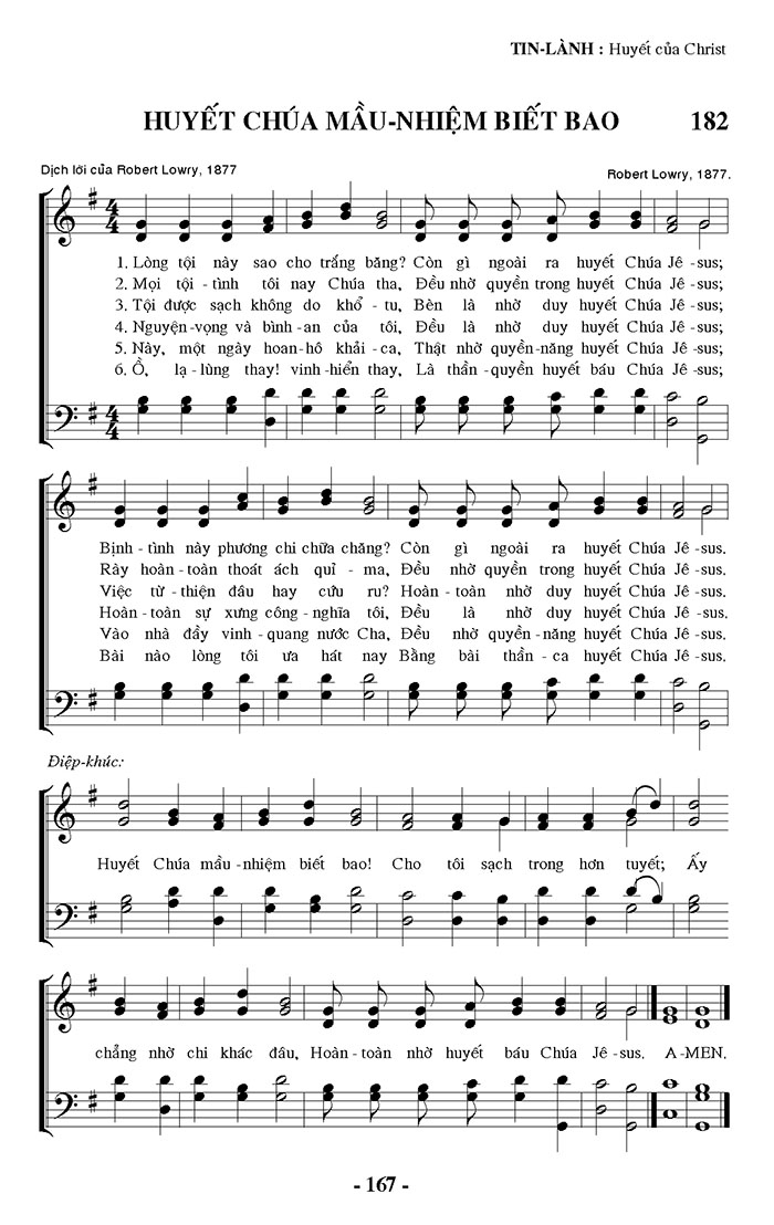 1. Lòng tội này sao cho trắng băng? Còn gì ngoài ra huyết Chúa Jê-sus; Bịnh - tình này phương chỉ chữa chăng? Còn gì ngoài ra huyết Chúa Jê-sus. 2. Mọi tội - tình tôi nay Chúa tha, Đều nhờ quyền trong huyết Chúa Jê-sus; Rày hoàn toàn thoát ách quỉ - ma, Đều nhờ quyền trong huyết Chúa Jê-sus. 3. Tội được sạch không do khổ tu, Bèn là nhờ duy huyết Chúa Jê-sus; Việc từ - thiện đâu hay cứu ru? Hoàn - toàn nhờ duy huyết Chúa Jê-sus. 4. Nguyện vọng và bình an của tôi, Đều là nhờ duy huyết Chúa Jê-sus; Hoàn - toàn sự xưng công - nghĩa tôi, Đều là nhờ duy huyết Chúa Jê-sus. 5. Này, một ngày hoan hô khải - ca, Thật nhờ quyền năng huyết Chúa Jê-sus; Vào nhà đầy vinh - quang nước Cha, Đều nhờ quyền - năng huyết Chúa Jê-sus. 6. Ồ, lạ - lùng thay! vinh - hiển thay, Là thần - quyền huyết báu Chúa Jê-sus; Bài nào lòng tôi ưa hát nay Bằng bài thần - ca huyết Chúa Jê-sus. Điệp khúc: Huyết Chúa mầu - nhiệm biết bao! Cho tôi sạch trong hơn tuyết; Ấy chẳng nhờ chi khác đâu, Hoàn - toàn nhờ huyết báu Chúa Jê-sus. A-MEN.