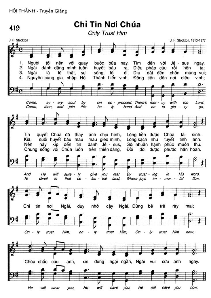 1. Người tội nên vội quay bước bữa nay, Tìm đến với Jê-sus ngay, Tin quyết Chúa đã thay anh chịu hình, Lòng liền được Chúa tái sinh. 2. Ngài đành dâng mình tuôn huyết báu ra, Diệu pháp cứu rỗi hồn ta; Kia, suối huyết báu mau gieo mình, Lòng sạch như tuyết tinh anh. 3. Ngài là lẽ thật, sự sống, lối đi, Dìu dắt đến chốn mừng vui; Nên hãy kíp đến tin danh Jê-sus, Gội nhuần hạnh phúc muôn thu. 4. Nguyện cùng gia nhập Hội Thánh hiển vinh, Đồng tiến đến nơi diệu vinh; Chung sống với Chúa luôn trên thiên đàng, Đời đời được phước hân hoan. Điệp khúc: Chỉ tin nơi Ngài, duy nhờ cậy Ngài, Đừng bê trễ rày mai; Chúa chắc cứu anh, xin đừng ngại ngần, Ngài vui cứu anh ngay.