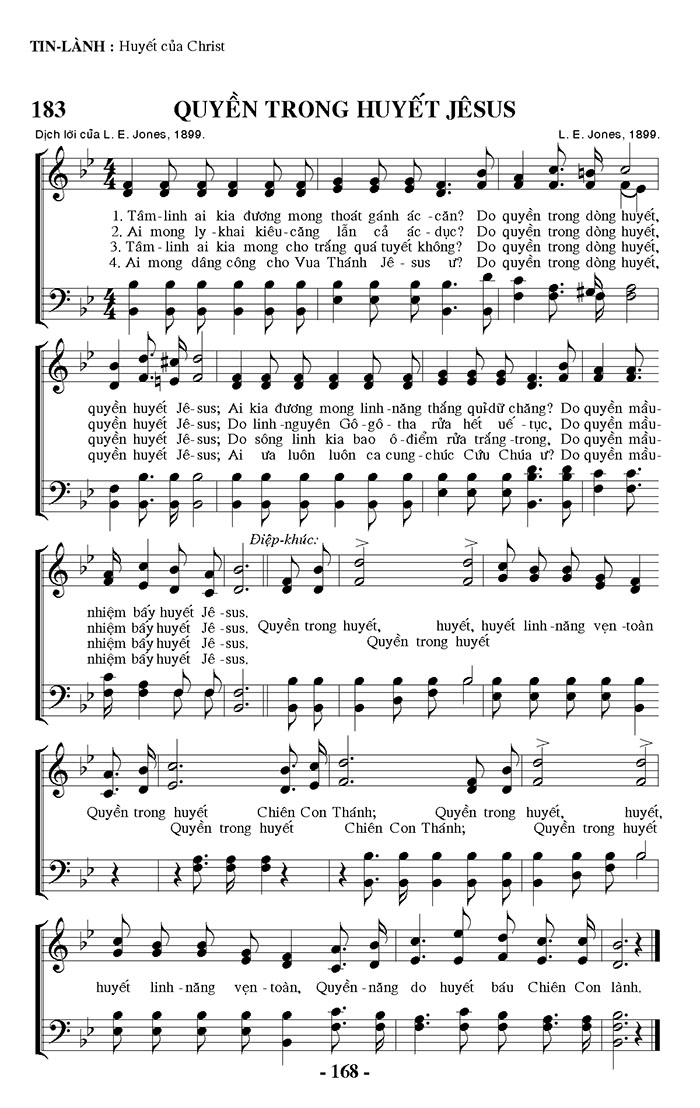 1. Tâm-linh ai kia đương mong thoát gánh ác - căn? Do quyền trong dòng huyết, quyền huyết Jê-sus; Ai kia đương mong linh-năng thắng quỉ dữ chăng? Do quyền mầu- 2. Ai mong ly khai kiêu-căng lẫn cả ác-dục? Do quyền trong dòng huyết, quyền huyết Jê-sus; Do linh-nguyên Gô-gô-tha rửa hết uế-tục, Do quyền mầu- 3. Tâm-linh ai kia mong cho trắng quá tuyết không? Do quyền trong dòng huyết, quyền huyết Jê-sus; Do sông linh kia bao ô-điểm rửa trắng-trong. Do quyền mầu- 4. Ai mong dâng công cho Vua Thánh Jê-sus ư? Do quyền trong dòng huyết, quyền huyết Jê-sus; Ai ưa luôn luôn ca cung-chúc Cứu Chúa ư? Do quyền mầu- Điệp khúc: nhiệm bấy huyết Jê-sus. nhiệm bấy huyết Jê-sus. Quyền trong huyết, huyết, huyết linh-năng vẹn-toàn nhiệm bấy huyết Jê-sus. Quyền trong huyết nhiệm bấy huyết Jê-sus. Quyền trong huyết Chiên Con Thánh; Quyền trong huyết, huyết, Quyền trong huyết Chiên Con Thánh; Quyền trong huyết huyết linh-năng vẹn-toàn, Quyền-năng do huyết báu Chiên Con lành.