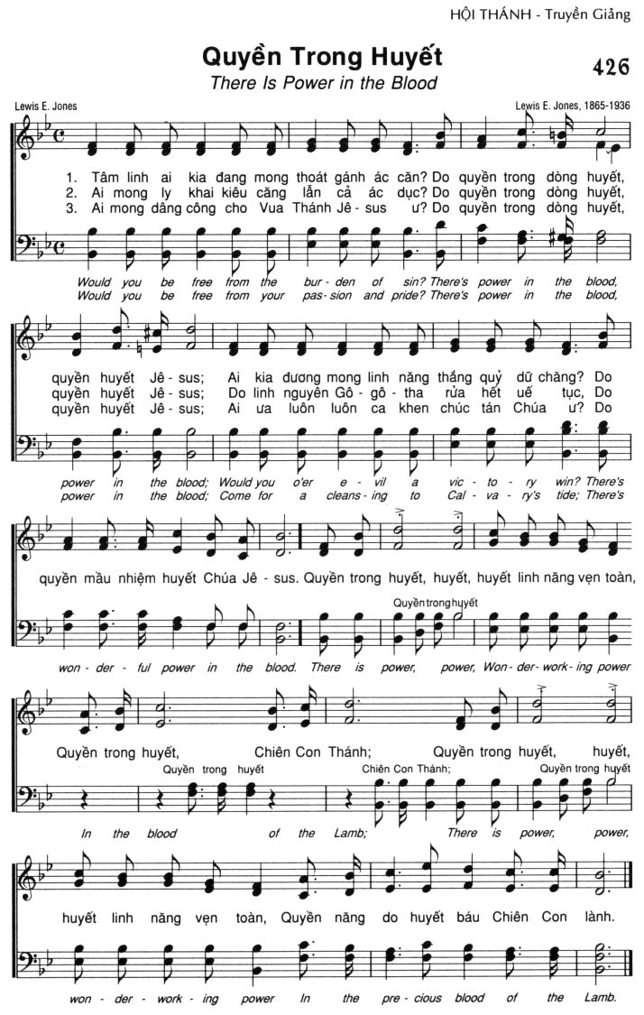 1. Tâm linh ai kia đang mong thoát gánh ác căn? Do quyền trong dòng huyết, quyền huyết Jê-sus; Ai kia đương mong linh năng thắng quỷ dữ chăng? Do quyền mầu nhiệm huyết Chúa Jê-sus. 2. Ai mong ly khai kiêu căng lẫn cả ác dục? Do quyền trong dòng huyết, quyền huyết Jê-sus; Do linh nguyên Gô-gô-tha rửa hết uế tục, Do quyền mầu nhiệm huyết Chúa Jê-sus. 3. Ai mong dâng công cho Vua Thánh Jê-sus ư? Do quyền trong dòng huyết, quyền huyết Jê-sus; Ai ưa luôn luôn ca khen chúc tán Chúa ư? Do quyền mầu nhiệm huyết Chúa Jê-sus. Điệp khúc: Quyền trong huyết, huyết, huyết linh năng vẹn toàn, Quyền trong huyết, Chiên Con Thánh; Quyền trong huyết, huyết, huyết linh năng vẹn toàn, Quyền năng do huyết báu Chiên Con lành.