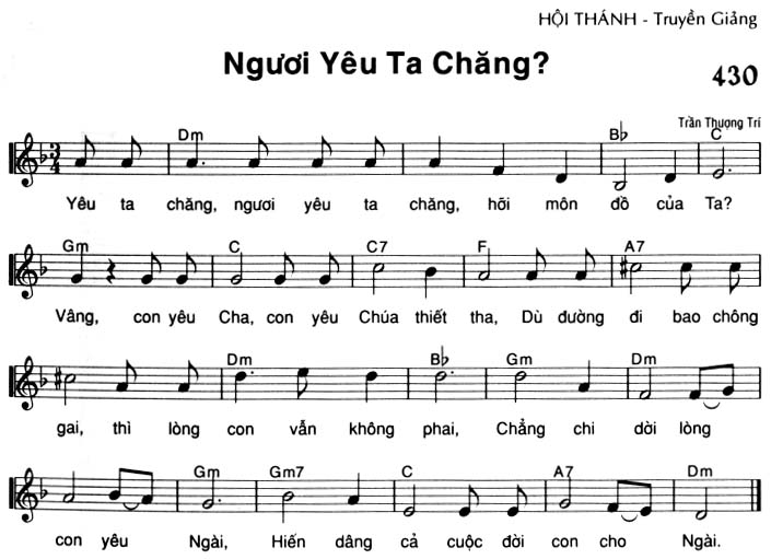 1. Yêu ta chăng, người yêu ta chăng, hỡi môn đồ của Ta? Vâng, con yêu Cha, con yêu Chúa thiết tha, Dù đường đi bao chông gai, thì lòng con vẫn không phai, Chẳng chi dời lòng con yêu Ngài, Hiến dâng cả cuộc đời con cho Ngài.