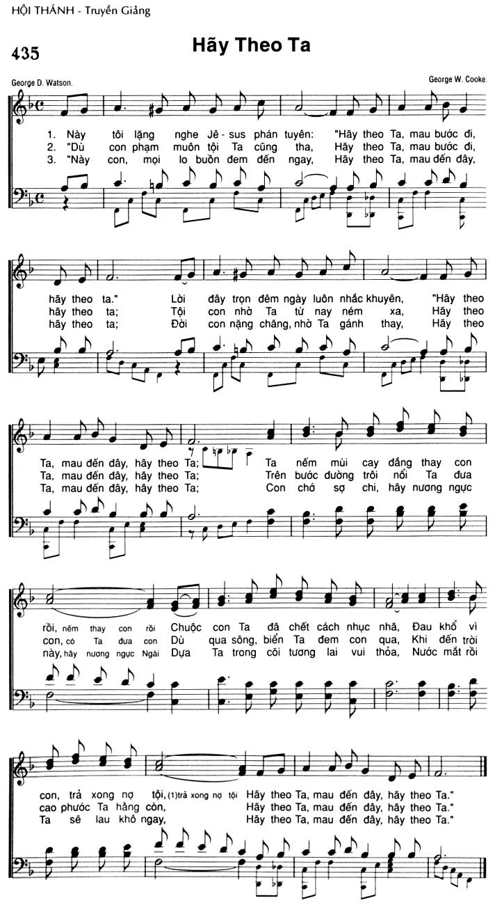 1. Này tôi lặng nghe Jêsus phán tuyên: "Hãy theo Ta, mau bước đi, hãy theo ta." Lời đây trọn đêm ngày luôn nhắc khuyên, Ta, mau đến đây, hãy theo Ta; Ta nếm mùi cay đắng thay con rồi, nếm thay con rồi Chuộc con Ta đã chết cách nhục nhã, Đau khổ vì con, trả xong nợ tội, (1)trả xong nợ tội Hãy theo Ta, mau đến đây, hãy theo Ta." 2. "Dù con phạm muôn tội Ta cũng tha, Hãy theo Ta, mau bước đi, hãy theo ta;" Tội con nhờ Ta từ nay ném xa, Ta, mau đến đây, hãy theo Ta; Trên bước đường trôi nổi Ta đưa con, có Ta đưa con Dù qua sông, biển Ta đem con qua, Khi đến trời cao phước Ta hằng còn, Hãy theo Ta, mau đến đây, hãy theo Ta." 3. "Này con, mọi lo buồn đem đến ngay, Hãy theo Ta, mau đến đây, hãy theo ta;" Đời con nặng chăng, nhờ Ta gánh thay, Ta, mau đến đây, hãy theo Ta; Con chớ sợ chi, hãy nương ngực này, hãy nương ngực Ngài Dựa Ta trong cõi tương lai vui thỏa, Nước mắt rồi Ta sẽ lau khô ngay, Hãy theo Ta, mau đến đây, hãy theo Ta."