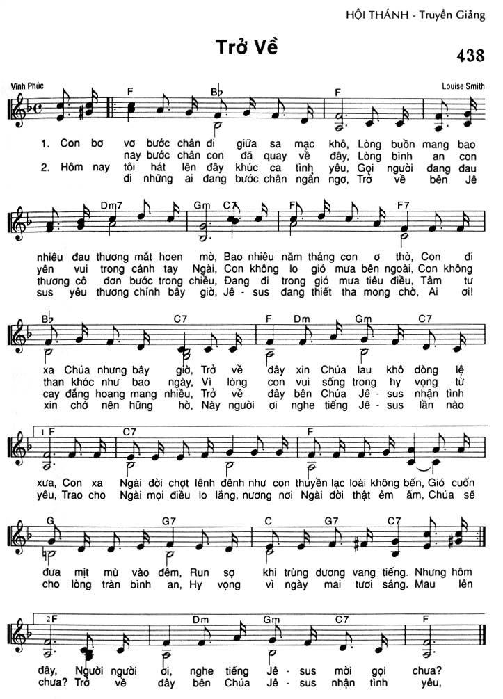 1. Con bơ vơ bước chân đi giữa sa mạc khô, Lòng buồn mang bao nhiêu đau thương mắt hoen mờ, Bao nhiêu năm tháng con ở thờ, Con đi xa Chúa nhưng bây giờ, Trở về đây xin Chúa lau khô dòng lệ xưa, Con xa Ngài đời chợt lênh đênh như con thuyền lạc loài không bến, Gió cuốn đưa mịt mù vào đêm, Run sợ khi trùng dương vang tiếng. Nhưng hôm nay, Người người ơi, nghe tiếng Jê-sus mời gọi chưa? Trở về đây bên Chúa Jê-sus nhận tình yêu, 2. Hôm nay bước chân con đã quay về đây, Lòng bình an con yên vui trong cánh tay Ngài, Con không lo gió mưa bên ngoài, Con không than khóc như bao ngày, Vì lòng con vui sống trong hy vọng từ yêu, Trao cho Ngài mọi điều lo lắng, nương nơi Ngài đời thật êm ấm, Chúa sẽ cho lòng tràn bình an, Hy vọng vì ngày mai tươi sáng. Mau lên đây, Người người ơi, nghe tiếng Jê-sus mời gọi chưa? Trở về đây bên Chúa Jê-sus nhận tình yêu,