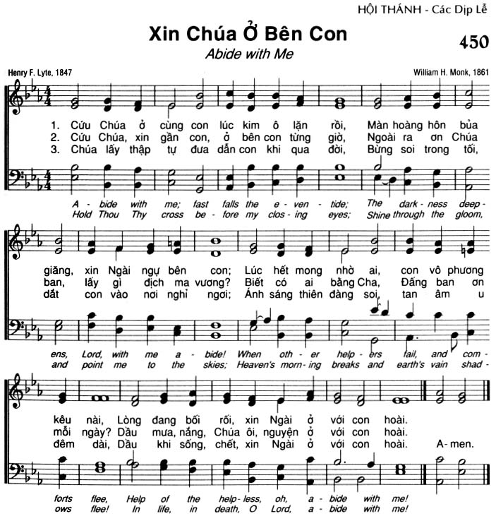 1. Cứu Chúa ở cùng con lúc kim ô lặn rồi, Màn hoàng hôn bủa giăng, xin Ngài ngự bên con; Lúc hết mong nhờ ai, con vô phương kêu nài, Lòng đang bối rối, xin Ngài ở với con hoài. 2. Cứu Chúa, xin gần con, ở bên con từng giờ, Ngoài ra ơn Chúa ban, lấy gì địch ma vương? Biết có ai bằng Cha, Đấng ban ơn mỗi ngày? Dầu mưa, nắng, Chúa ôi, nguyện ở với con hoài. 3. Chúa lấy thập tự đưa dẫn con khi qua đời, Bừng soi trong tối, dắt con vào nơi nghỉ ngơi; Ánh sáng thiên đàng soi, tan âm u đêm dài, Dầu khi sống, chết, xin Ngài ở với con hoài. A-men.