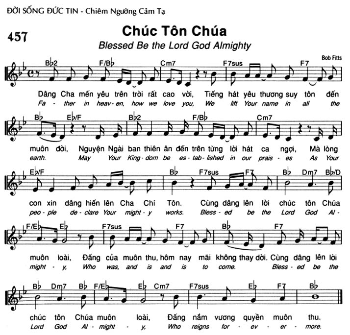 1. Dâng Cha mến yêu trên trời rất cao vời, Tiếng hát yêu thương suy tôn đến muôn đời, Nguyện Ngài ban thiên ân đến trên từng lời hát ca ngợi, Mà lòng con xin dâng hiến lên Cha Chí Tôn. Cùng dâng lên lời chúc tôn Chúa muôn loài, Đấng của muôn thu, hôm nay mãi không thay dời. Cùng dâng lên lời chúc tôn Chúa muôn loài, Đấng nắm vương quyền muôn thu.