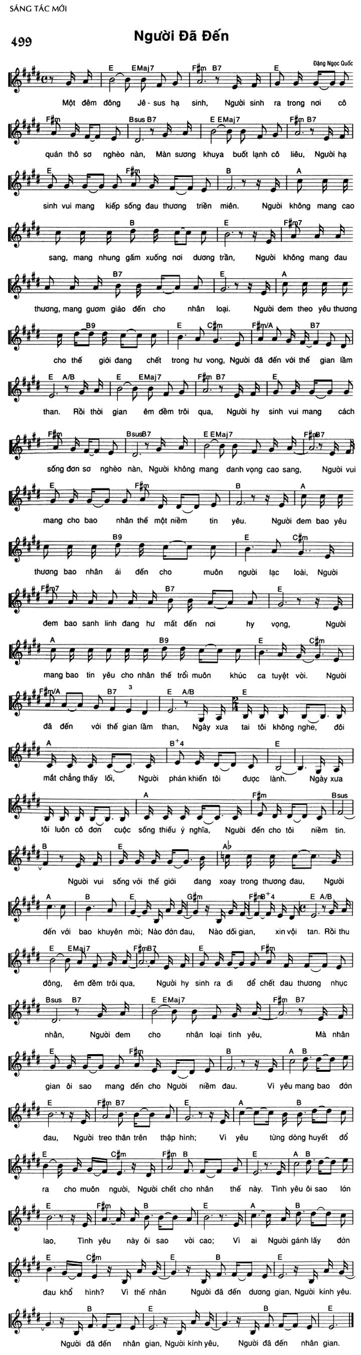 1. Một đêm đông Jêsus hạ sinh, Người sinh ra trong nơi cô quán thô sơ nghèo nàn, Màn sương khuya buốt lạnh cô liêu, Người hạ sinh vui mang kiếp sống đau thương triền miên. Người không mang cao sang, mang nhung gấm xuống nơi dương trần, Người không mang đau thương, mang gươm giáo đến cho nhân loại. Người đem theo yêu thương cho thế giới đang chết trong hư vong, Người đã đến với thế gian làm than. Rồi thời gian êm đềm trôi qua, Người hy sinh vui mang cách sống đơn sơ nghèo nàn, Người không mang danh vọng cao sang, Người vui mang cho bao nhân thế một niềm tin yêu. Người đem bao yêu thương bao nhân ái đến cho muôn người lạc loài, Người đem bao sanh linh đang hư mất đến nơi hy vọng, Người mang bao tin yêu cho nhân thế trổi muôn khúc ca tuyệt vời. Người đã đến với thế gian lầm than, Ngày xưa tai tôi không nghe, đôi mắt chẳng thấy lối, Người phán khiến tôi được lành. Ngày xưa tôi luôn cô đơn cuộc sống thiếu ý nghĩa, Người đến cho tôi niềm tin. Người vui sống với thế giới đang xoay trong thương đau, Người đến với bao khuyên mời; Nào đớn đau, Nào dối gian, xin vội tan. Rồi thu đông, êm đềm trôi qua, Người hy sinh ra đi để chết đau thương nhục nhằn, Người đem cho nhân loại tình yêu, Mà nhân gian ôi sao mang đến cho Người niềm đau. Vì yêu mang bao đớn đau, Người treo thân trên thập hình; Vì yêu từng dòng huyết đổ ra cho muôn người, Người chết cho nhân thế này. Tình yêu ôi sao lớn lao, Tình yêu này ôi sao vời cao; Vì ai Người gánh lấy đớn đau khổ hình? Vì thế nhân Người đã đến dương gian, Người kính yêu. Người đã đến nhân gian, Người kính yêu, Người đã đến nhân gian.