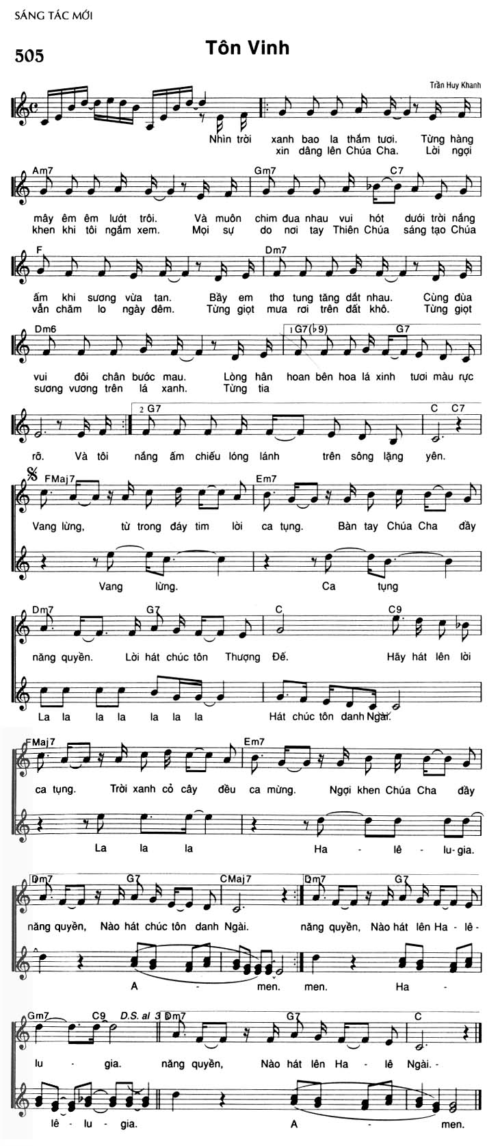 1. Nhìn trời xanh bao la thắm tươi. Từng hàng mây êm êm lướt trôi. Và muôn chim đua nhau vui hót dưới trời nắng ấm khi sương vừa tan. Bầy em thơ tung tăng dắt nhau. Cùng đùa vui đôi chân bước mau. Lòng hân hoan bên hoa lá xinh tươi màu rực rõ. Và tôi nắng ấm chiếu lóng lánh trên sông lặng yên. 2. Xin dâng lên Chúa Cha. Lời ngợi khen khi tôi ngắm xem. Mọi sự do nơi tay Thiên Chúa sáng tạo Chúa vẫn chăm lo ngày đêm. Từng giọt mưa rơi trên đất khô. Từng tia sương vương trên lá xanh. Lòng hân hoan bên hoa lá xinh tươi màu rực rõ. Và tôi nắng ấm chiếu lóng lánh trên sông lặng yên. 3. Vang lừng, từ trong đáy tim lời ca tụng. Bàn tay Chúa Cha đầy năng quyền. Lời hát chúc tôn Thượng Đế. Hãy hát lên lời La la la la la la la. Hát chúc tôn danh Ngài. ca tụng. Trời xanh cỏ cây đều ca mừng. Ngợi khen Chúa Cha đầy năng quyền, Nào hát chúc tôn danh Ngài. năng quyền, Nào hát lên Ha lê - lu gia. năng quyền, Nào hát lên Ha lê Ngài. - lê lu gia. Điệp khúc: Vang lừng. Ca tụng. La la la la Ha lê lu-gia. Ha men. men. Ha men.