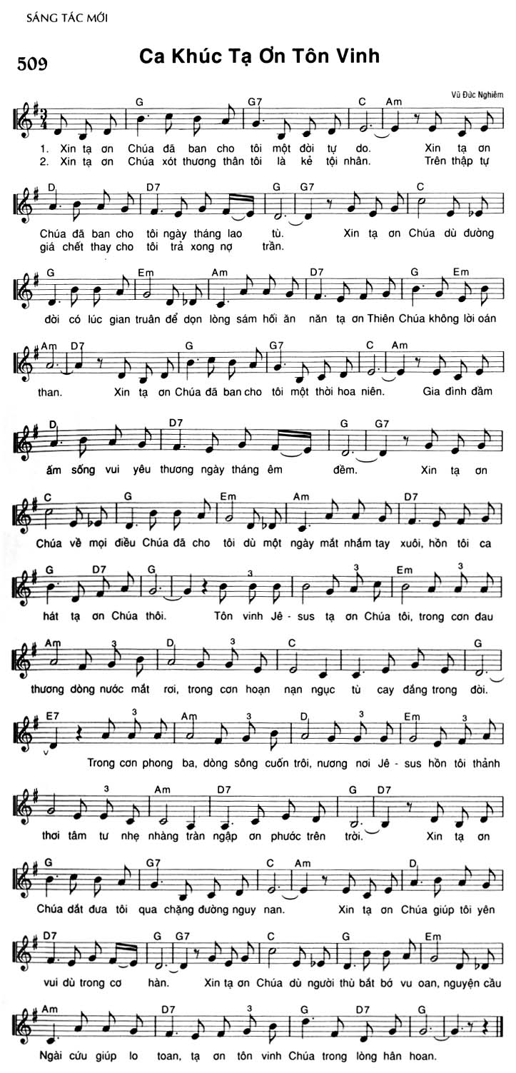 1. Xin tạ ơn Chúa đã ban cho tôi một đời tự do. Xin tạ ơn Chúa đã ban cho tôi ngày tháng lao tù. Xin tạ ơn Chúa dù đường đời có lúc gian truân để dọn lòng sám hối ăn năn tạ ơn Thiên Chúa không lời oán than. Xin tạ ơn Chúa đã ban cho tôi một thời hoa niên. Gia đình đầm ấm sống vui yêu thương ngày tháng êm đềm. Xin tạ ơn Chúa về mọi điều Chúa đã cho tôi dù một ngày mắt nhắm tay xuôi, hồn tôi ca hát tạ ơn Chúa thôi. Xin tạ ơn Chúa dù người thủ bắt bớ vu oan, nguyện cầu Ngài cứu giúp lo toan, tạ ơn tôn vinh Chúa trong lòng hân hoan. 2. Xin tạ ơn Chúa xót thương thân tôi là kẻ tội nhân. Trên thập tự giá chết thay cho tôi trả xong nợ trần. Xin tạ ơn Chúa dù đường đời có lúc gian truân để dọn lòng sám hối ăn năn tạ ơn Thiên Chúa không lời oán than. Xin tạ ơn Chúa đã ban cho tôi một thời hoa niên. Gia đình đầm ấm sống vui yêu thương ngày tháng êm đềm. Xin tạ ơn Chúa về mọi điều Chúa đã cho tôi dù một ngày mắt nhắm tay xuôi, hồn tôi ca hát tạ ơn Chúa thôi. Xin tạ ơn Chúa dù người thủ bắt bớ vu oan, nguyện cầu Ngài cứu giúp lo toan, tạ ơn tôn vinh Chúa trong lòng hân hoan. Điệp khúc: Tôn vinh Jêsus tạ ơn Chúa tôi, trong cơn đau thương dòng nước mắt rơi, trong cơn hoạn nạn ngục tù cay đắng trong đời. Trong cơn phong ba, dòng sông cuốn trôi, nương nơi Jê-sus hồn tôi thảnh thơi tâm tư nhẹ nhàng tràn ngập ơn phước trên trời. Xin tạ ơn Chúa dắt đưa tôi qua chặng đường nguy nan. Xin tạ ơn Chúa giúp tôi yên vui dù trong cơ hàn.